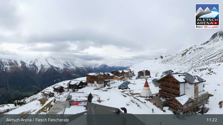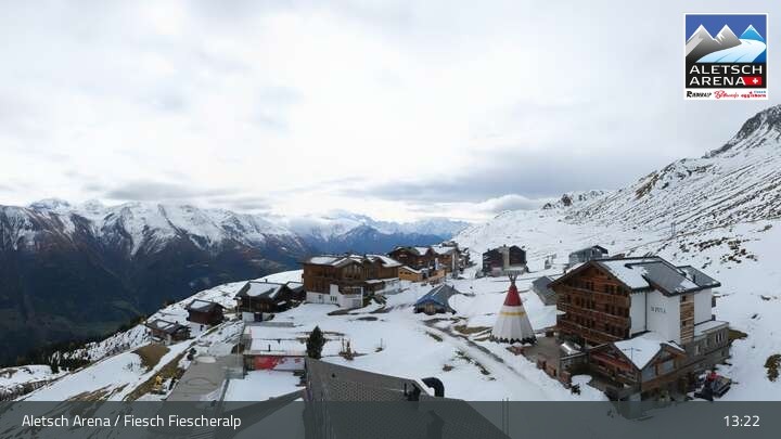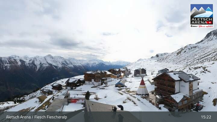 Die Livekamera zeigt das kleine Dorf auf der Fiescheralp in der Aletsch Arena und die dortigen Skipisten.