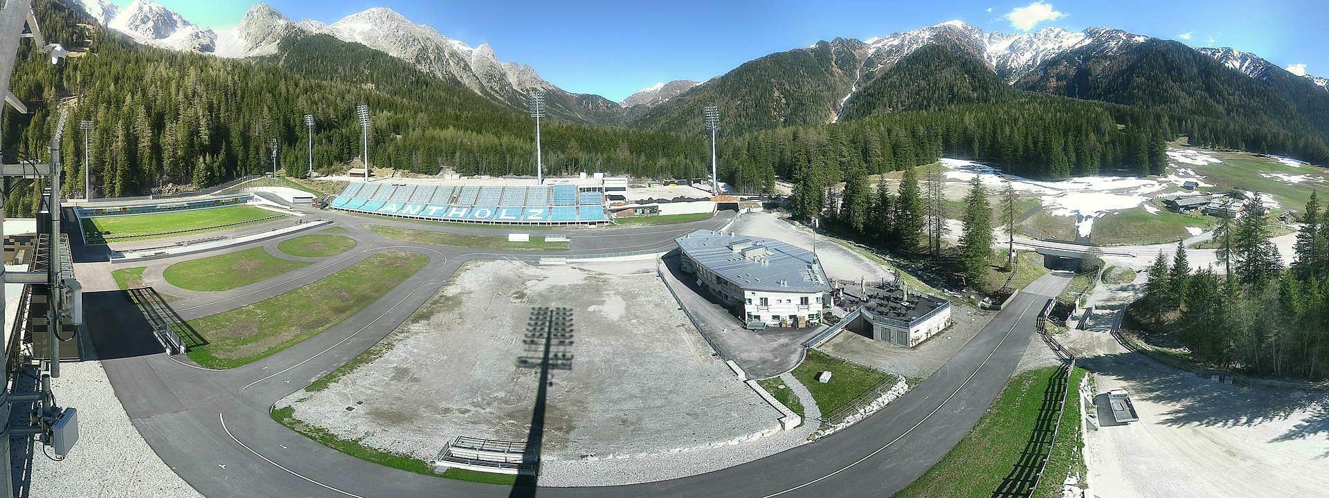 Blick über das Antholzer Biathlonstadion mit Schießstand und Tribüne. Dort ist jedes Jahr der Biathlon-Weltcup zu Gast. Im Februar 2026 finden dort auch die Olympischen Winterspiele statt. Während der Rennen kann es aus rechtlichen Gründen zu Übertragungspausen kommen.