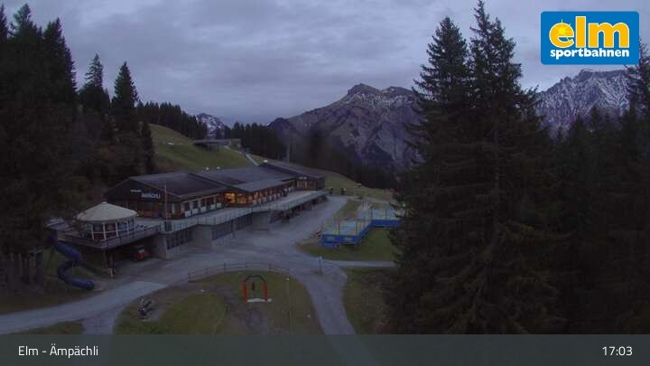 Die Webcam blickt auf das Bergrestaurant Ämpächli in Elm. Hungrige Skifahrer stärken sich hier unter anderem an einer Pasta-Station und einem Salatbuffet. Direkt daneben befindet sich das Übungsareal für Kinder.