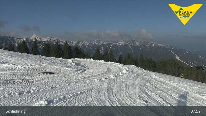 Die Webcam bietet einen Rundumblick von der Bergstation auf der Planai, die Skiabfahrt von Schladming.