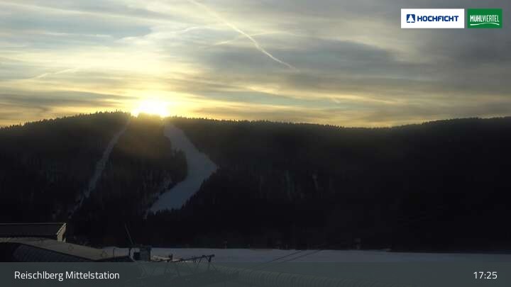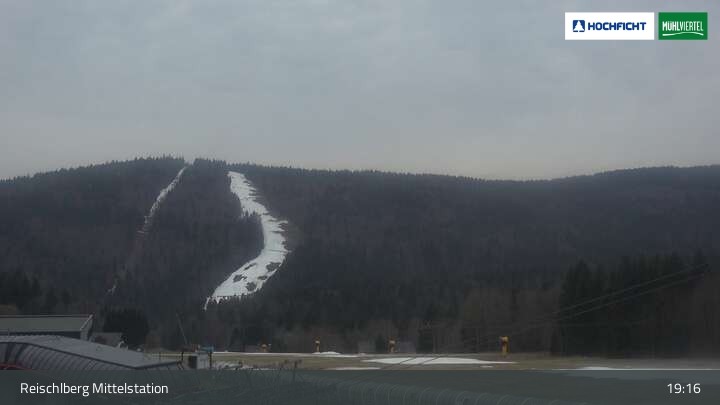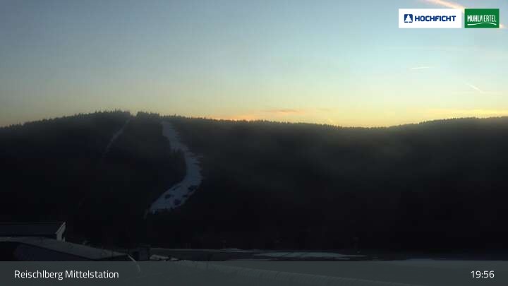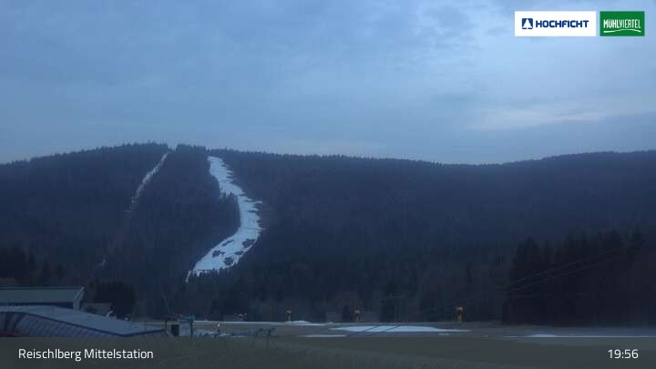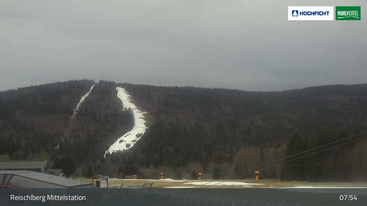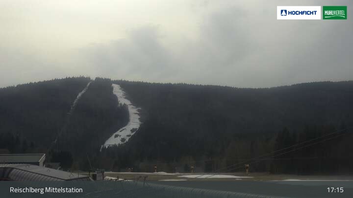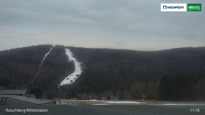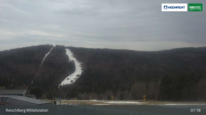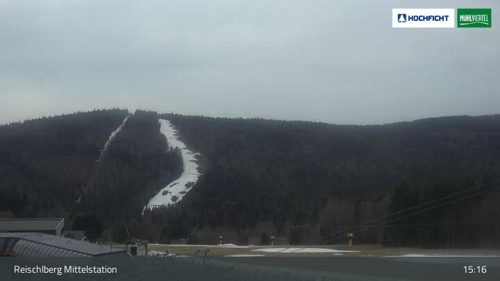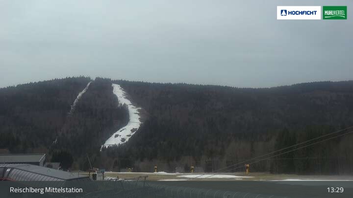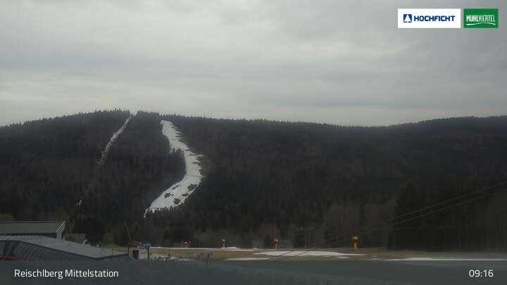 Ausblick von der Mittelstation Reischlberg im Skigebiet Hochficht. Man sieht von dort unter anderem auch die beiden Holzschlaglifte. Dort befindet sich neben mehreren blauen Abfahrten ein Förderband für Anfänger, ein kleiner Spielplatz und ein Gasthaus.