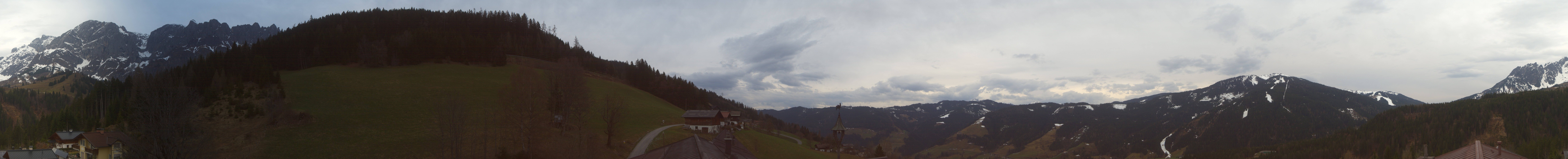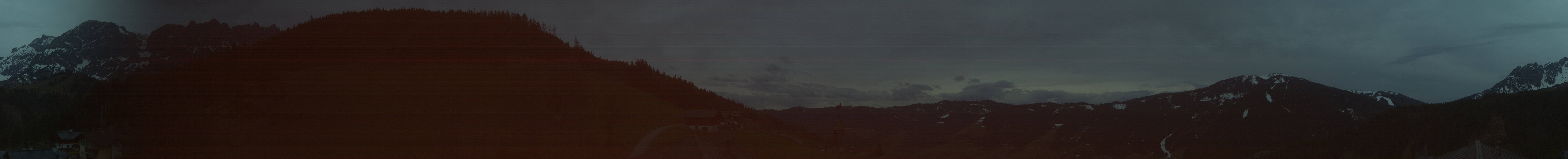 360-Grad-Webcam am Hotel Bergheimat in Mühlbach. Zu sehen sind auch Teile des Skigebiets Hochkönig, unter anderem der Gipfel des Schneebergs und die Kabinenbahn Karbachalm.