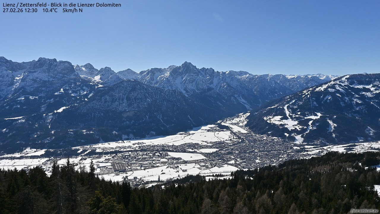 Blick vom Zettersfeld über die Stadt Lienz in Osttirol. Im Hintergrund sind die Lienzer Dolomiten zu erkennen. Am rechten Bildrand sieht man das zweite Lienzer Skigebiet - den Hochstein. Hier finden auch die alpinen Weltcuprennen der Damen statt.