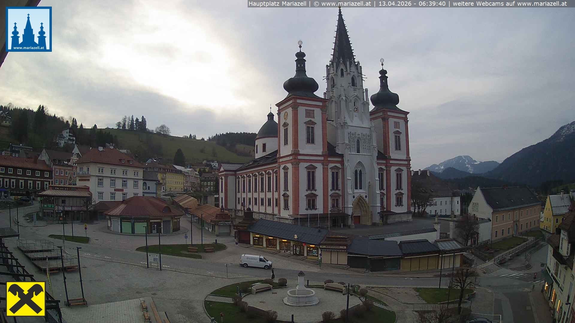 Archiviertes Webcam Bild: Mariazell: Hauptplatz und Basilika am 13.04.2026 um 06:09 Uhr Aktuell