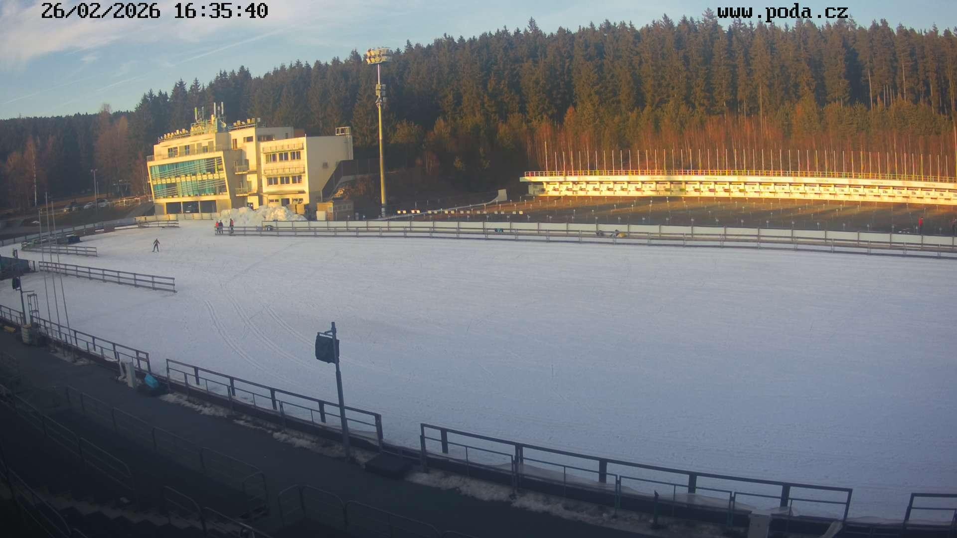 Blick von den Tribünen auf den Schießstand in der Vysocina Arena in Nové Město. Dort befindet sich auch der Start- und Zielbereich. Für die Biathlon-WM 2024 wurde das Stadion für über 20 Millionen Euro modernisiert. Während der Rennen kann es aus rechtlichen Gründen zu Übertragungspausen kommen.