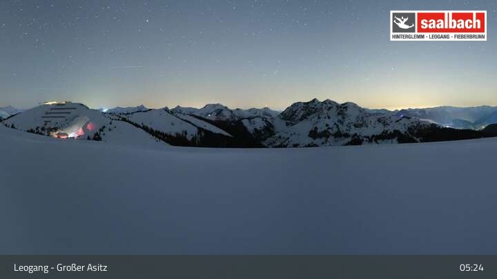Ausblick vom Großen Asitz in Leogang über die Skipisten und die umliegenden Alpen.