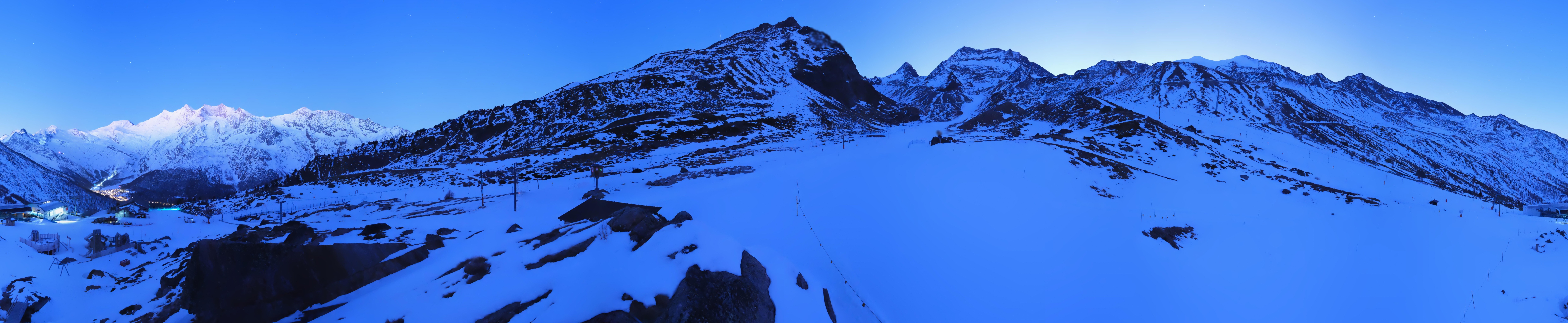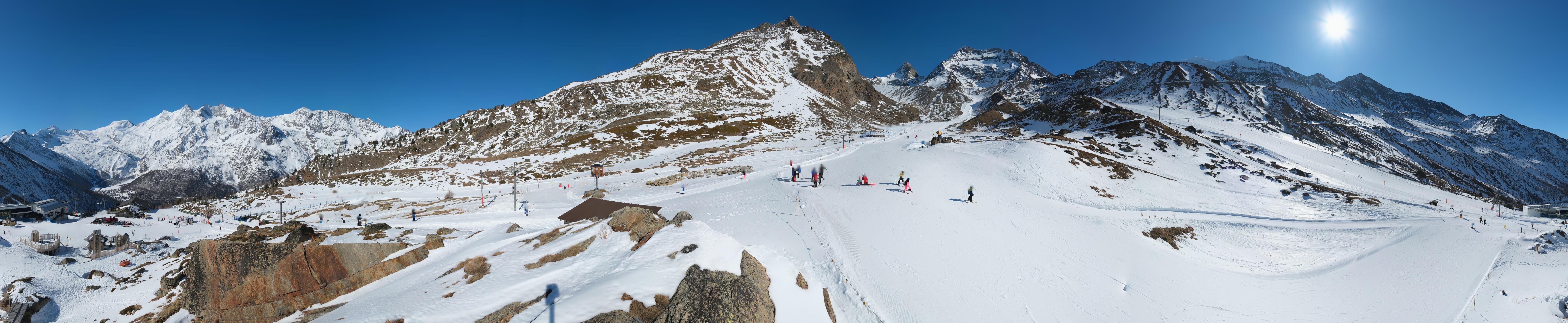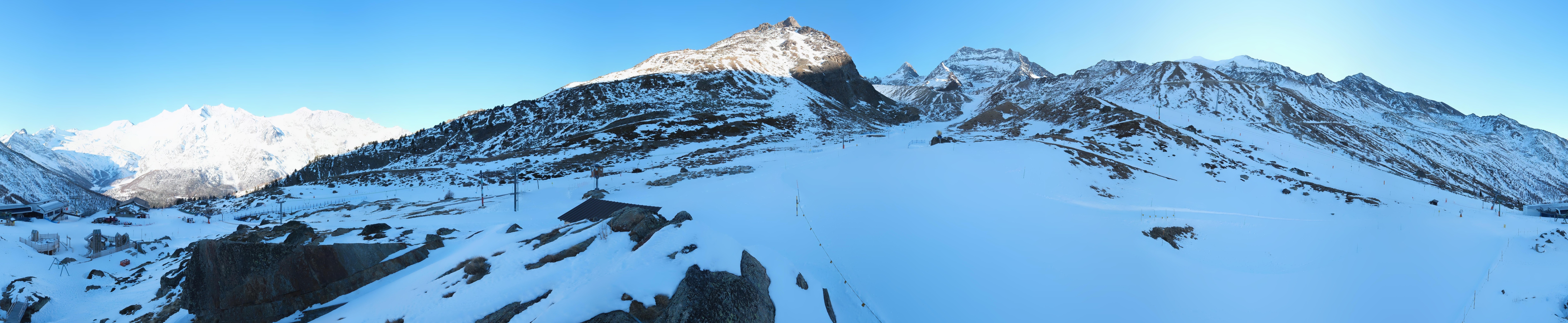 Die Roundshot-Cam befindet sich oberhalb der Mittelstation der Kreuzboden Gondelbahn im Schweizer Skigebiet Saas-Grund Hohsaas und bietet einen tollen 360-Grad-Blick auf das Skigebiet mit seiner fantastischen Berglandschaft.