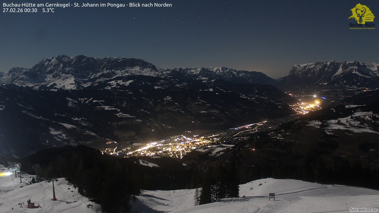 An der Buchau-Hütte am Gernkogel bei St. Johann im Pongau befindet sich diese Webcam mit Blick nach Nordwesten. In der Mitte befinden sich die Städte St. Johann im Pongau und Bischofshofen. Links erhebt sich der Hochkönig und rechts im Bild ist das Tennengebirge zu sehen.
