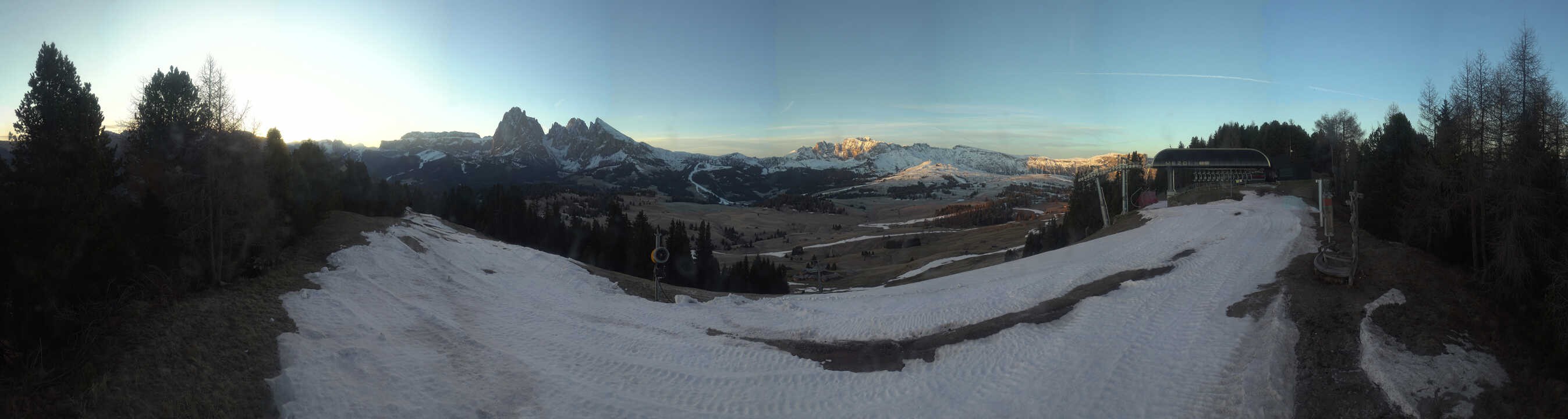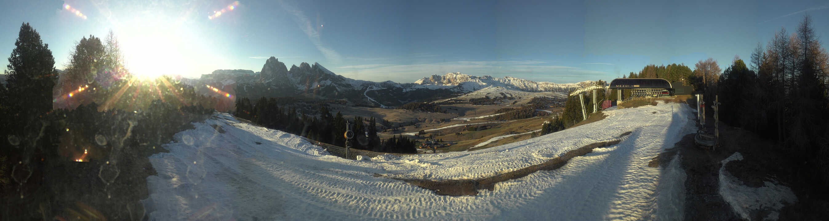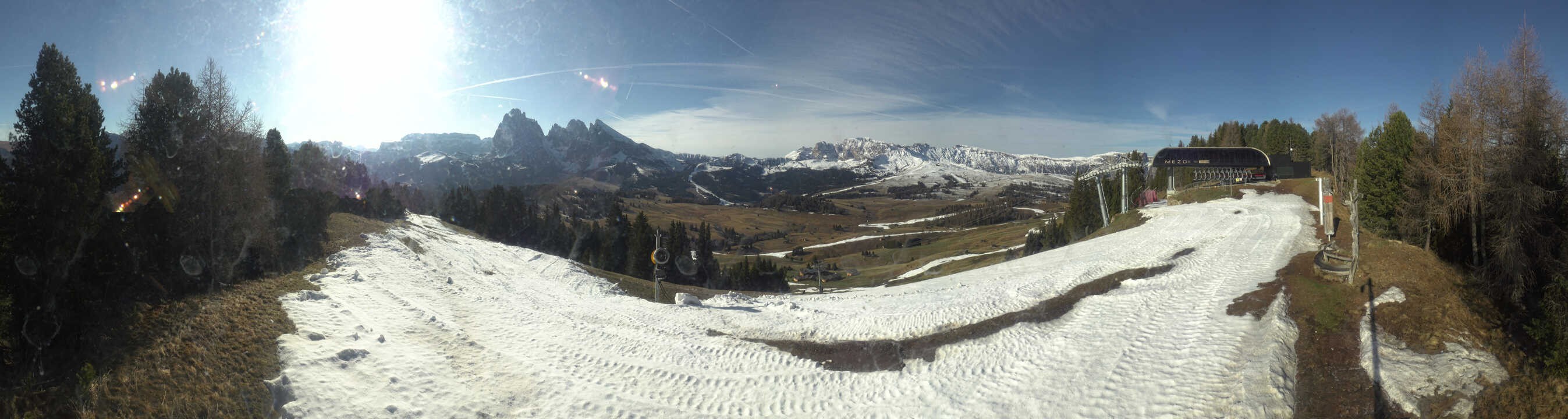 Die Panorama-Kamera zeigt den Blick von der Mezdi Bergstation aus. Zu sehen sind der Mezdi Sessellift, die Seiser Alm, die Puez-Geisler-Gruppe, den Grödner und die Sellagruppe.