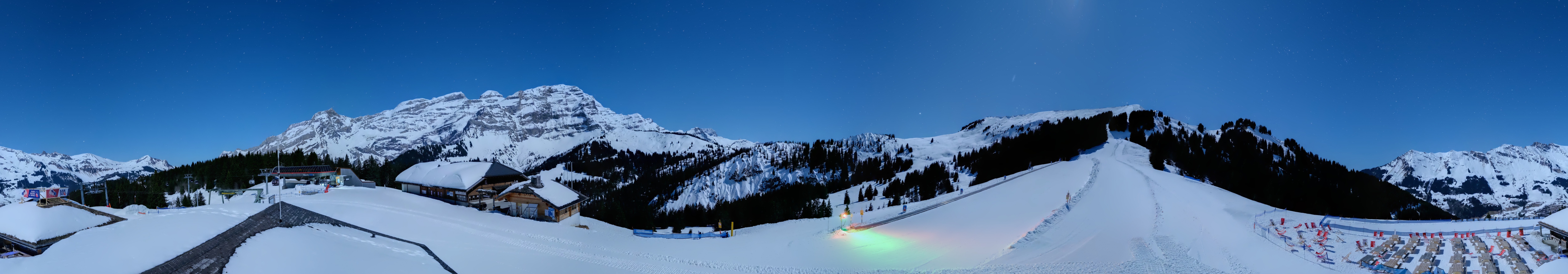 Direkt am Lift Diablerets-Isenau im Skigebiet Villars-Gryon-Diablerets in der Schweiz gelegen, bietet die Roundshot-Cam einen fantastischen 360-Grad-Blick auf die umliegende Bergwelt, den Ayerne Skilift und das Bergrestaurant Le Resto d'Isenau.