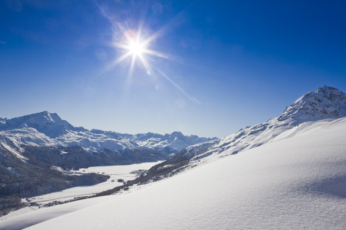 Aussicht von der Mittelstation Murtel im Skigebiet Corvatsch-Furtschellas über das Oberengadin. Zu Sehen sind die Orte Silvaplana und St. Moritz.