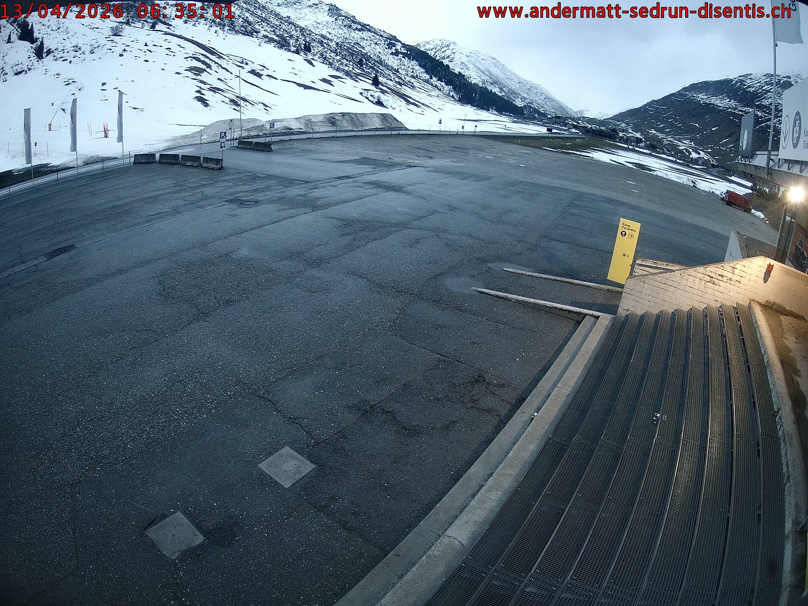 Archiviertes Webcam Bild: Andermatt: Parkplatz Gemsstockbahn am 13.04.2026 um 06:36 Uhr 06:00