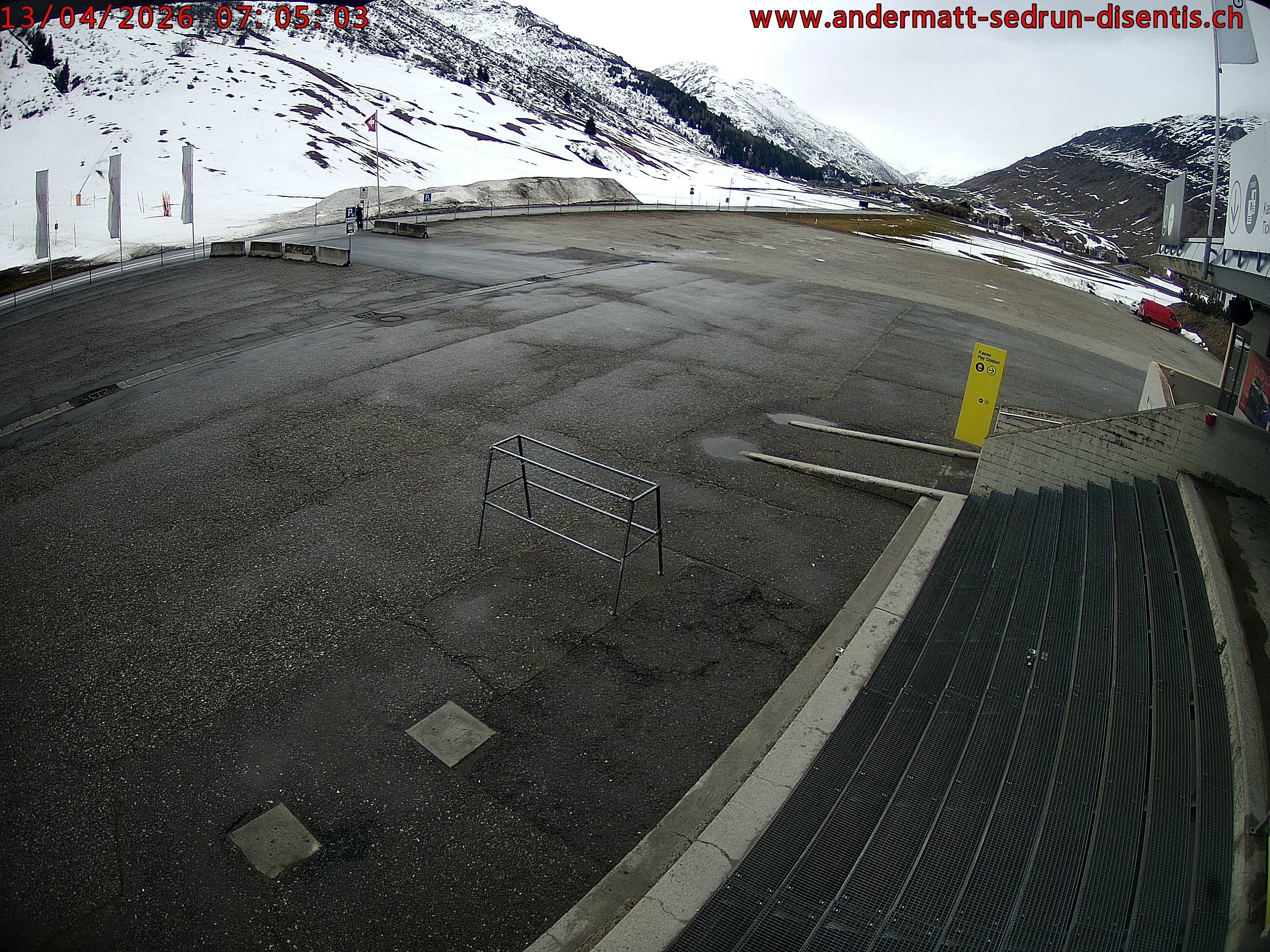 Archiviertes Webcam Bild: Andermatt: Parkplatz Gemsstockbahn am 13.04.2026 um 07:36 Uhr 07:00