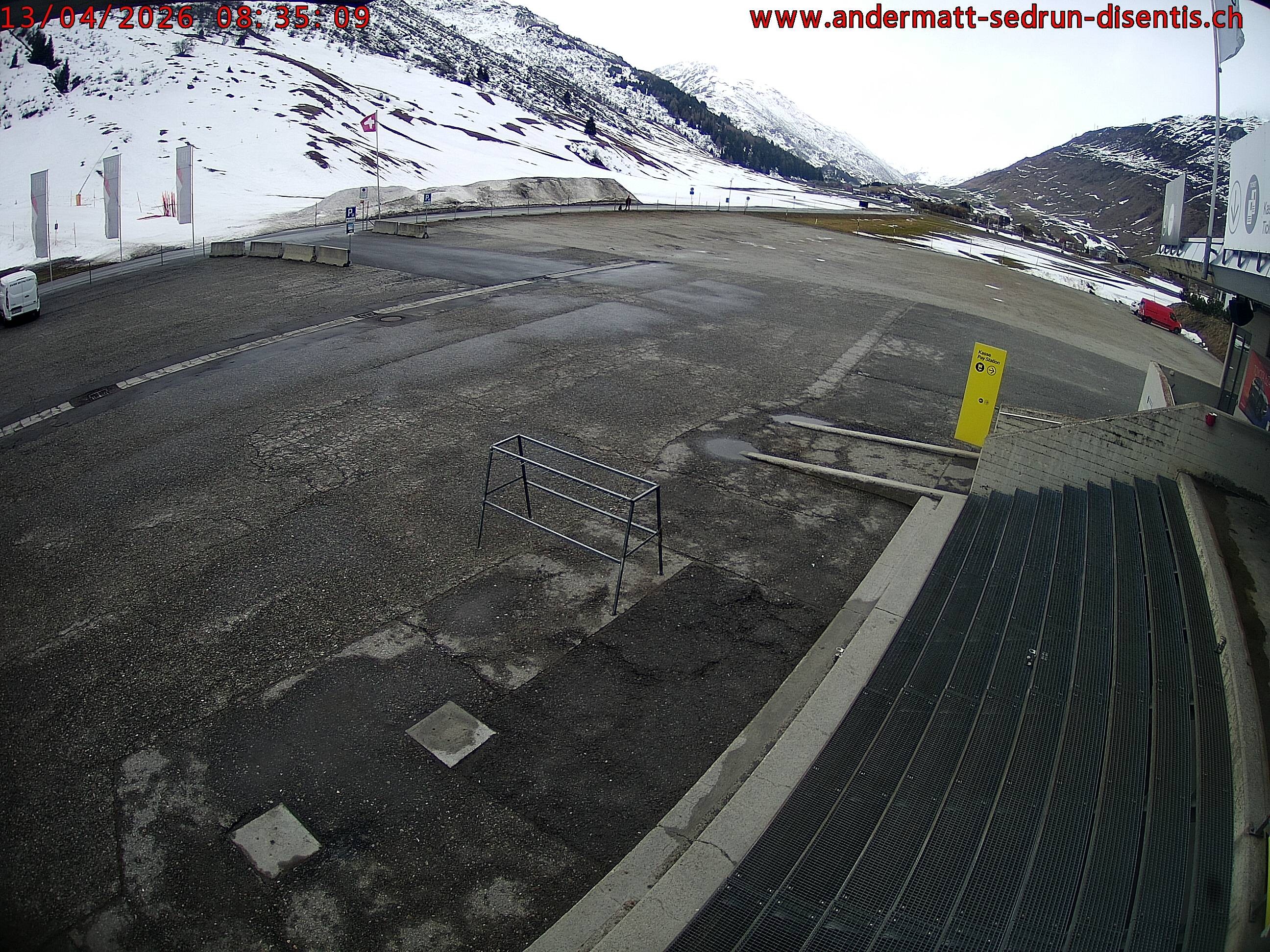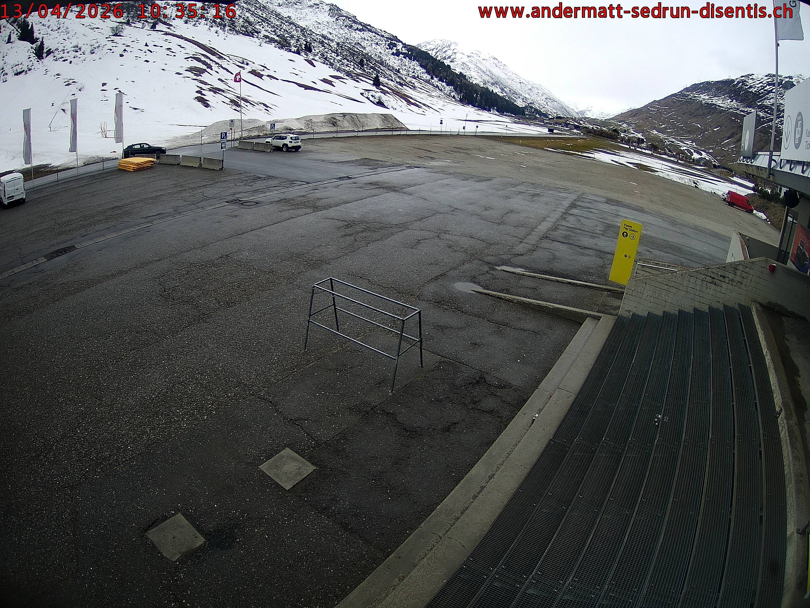 Archiviertes Webcam Bild: Andermatt: Parkplatz Gemsstockbahn am 13.04.2026 um 08:36 Uhr 08:00