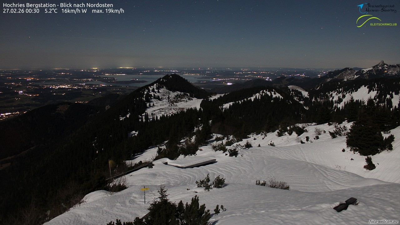 Die Webcam befindet sich an einem Nebengebäude der Hochries-Seilbahn an der Dachkante. Im Vordergrund ist der Drachenflieger-Startplatz, links unten starten die Gleitschirmflieger. Dahinter ist der Riesenberg und rechts die Kampenwand. In der Ferne ist der Chiemsee erkennbar.