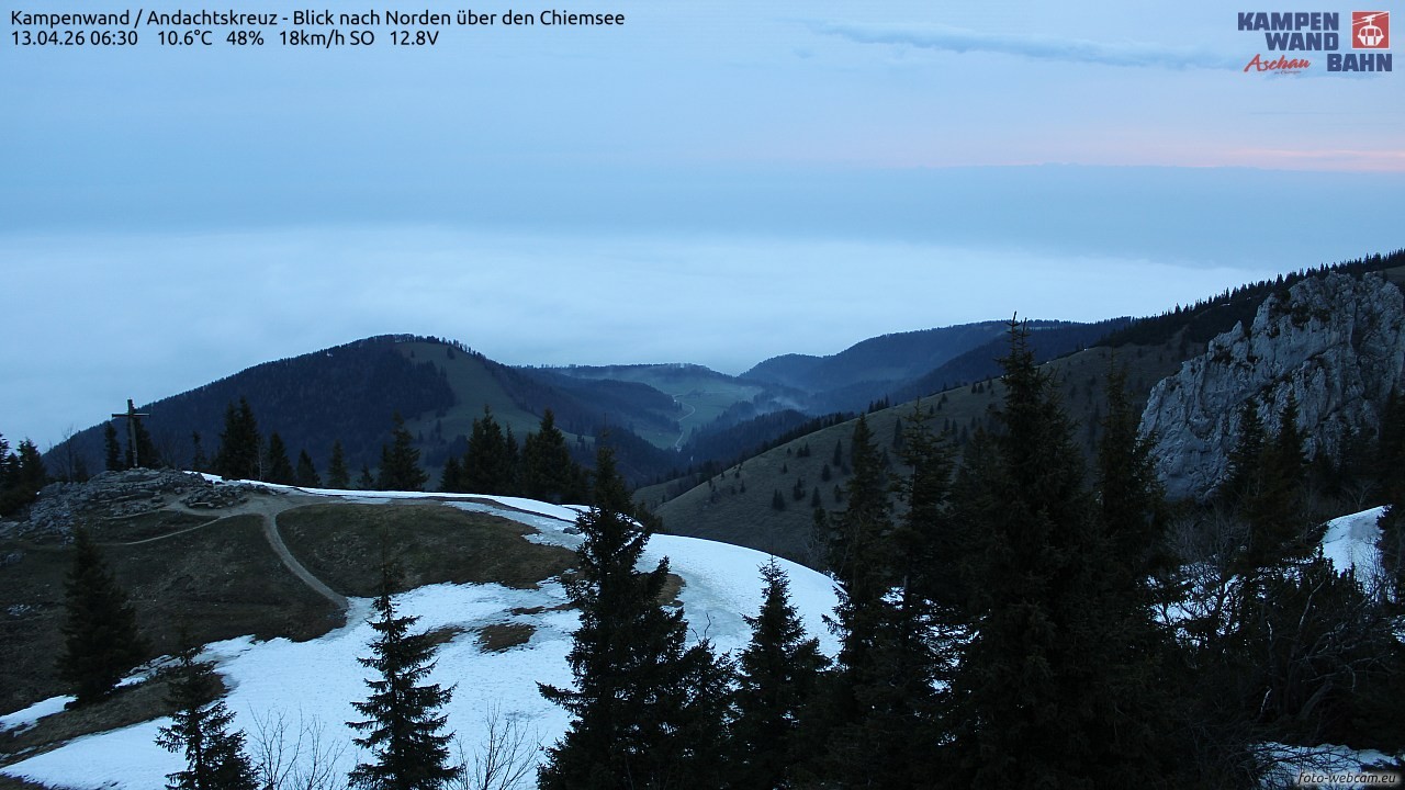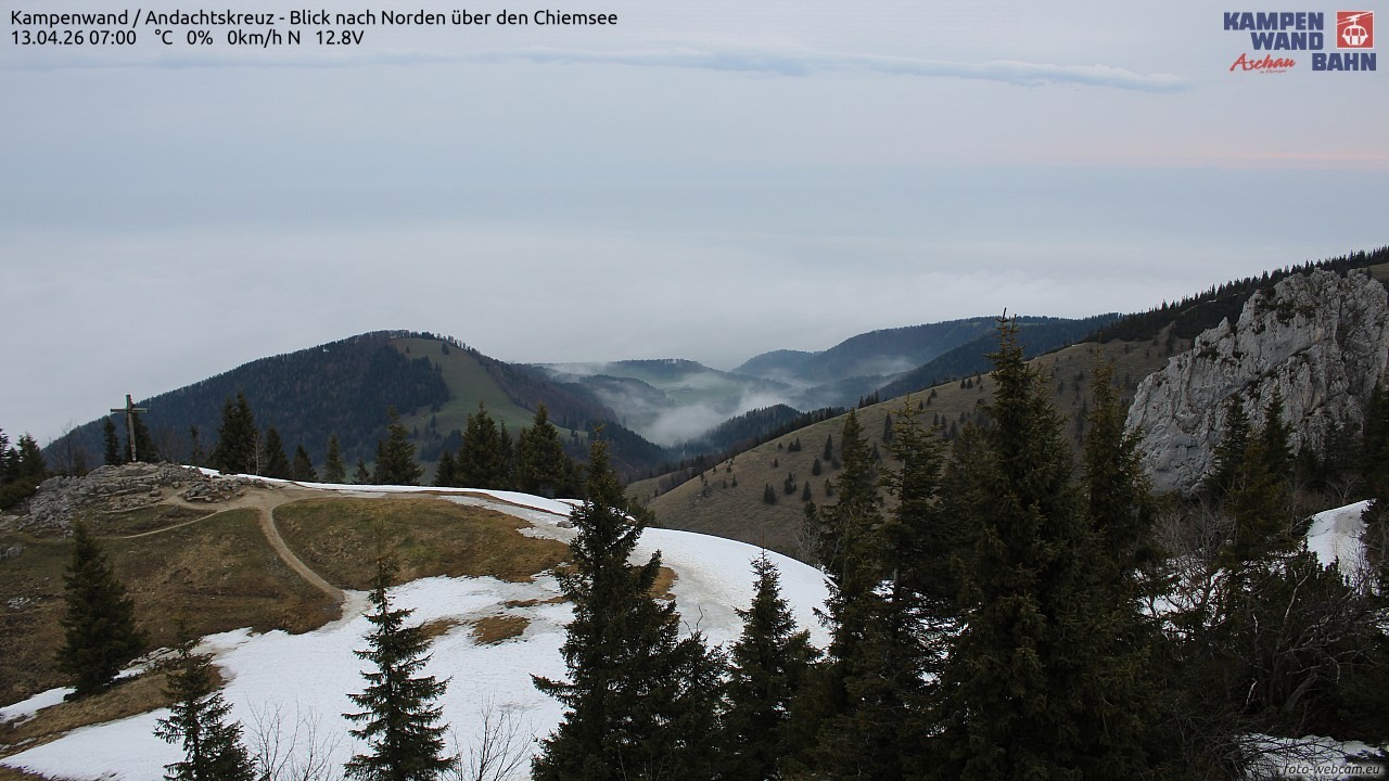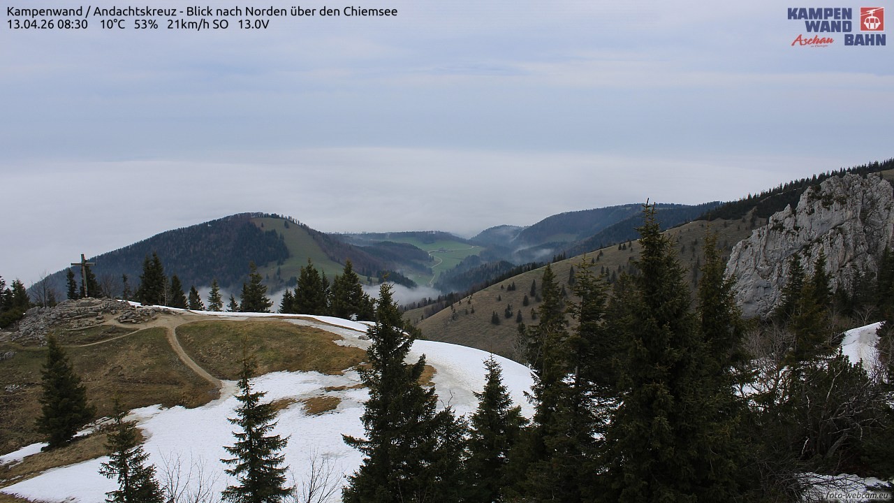 Die Webcam befindet sich am Grat zwischen der Seilbahn-Bergstation und dem Gipfel der Kampenwand. Du blickst Richtung Norden ins Chiemgau. Links im Bild ist das Kampenwand-Andachtskreuz und rechts der Staffelstein zu sehen. Im Hintergrund ist der Chiemsee zu sehen.