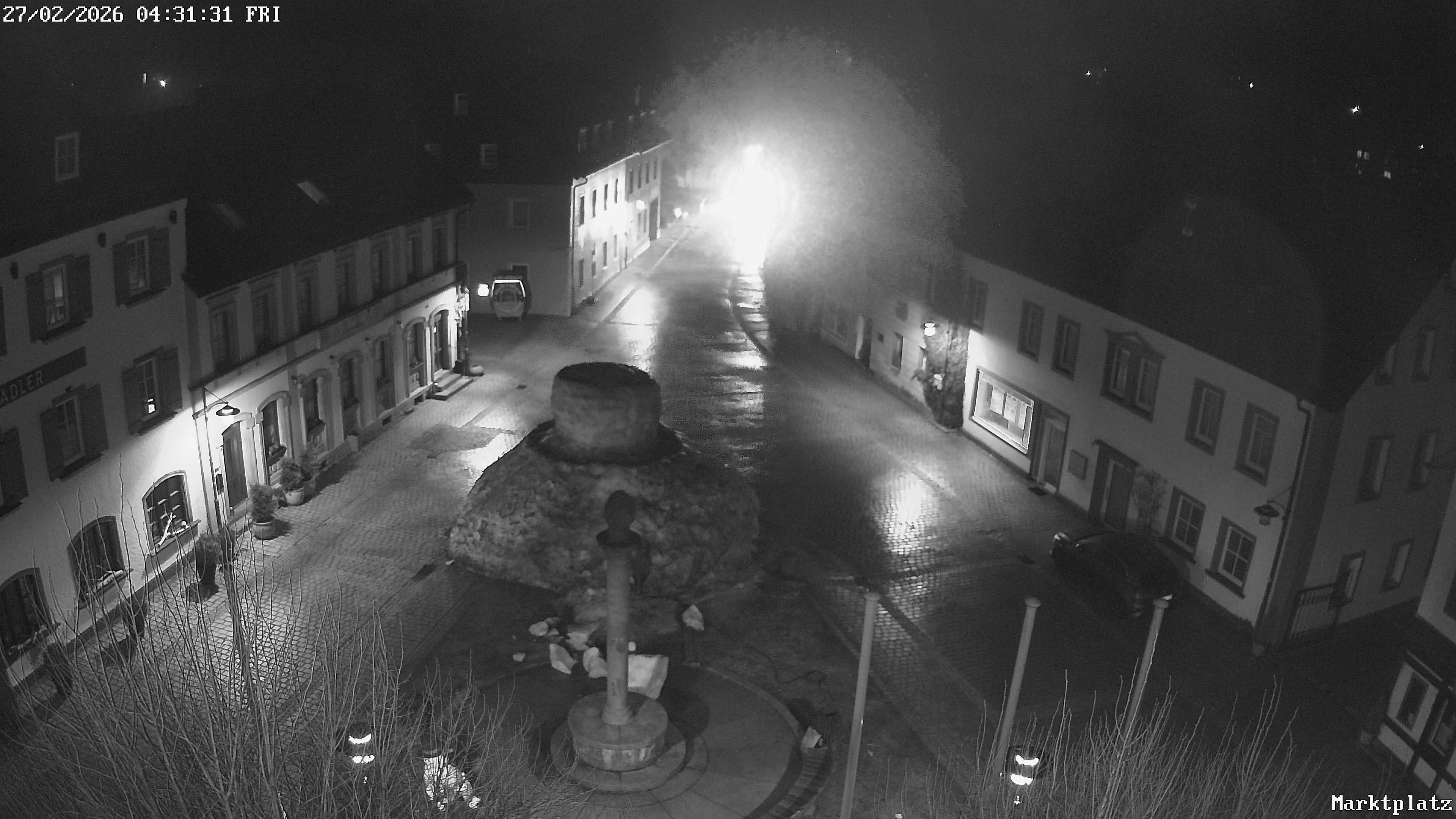 Blick über den Marktplatz von Bischofsgrün im Fichtelgebirge. Im Winter wird hier seit Jahren der größte Schneemann Deutschlands aufgebaut. Im Sommer ist der Maibaum zu sehen.