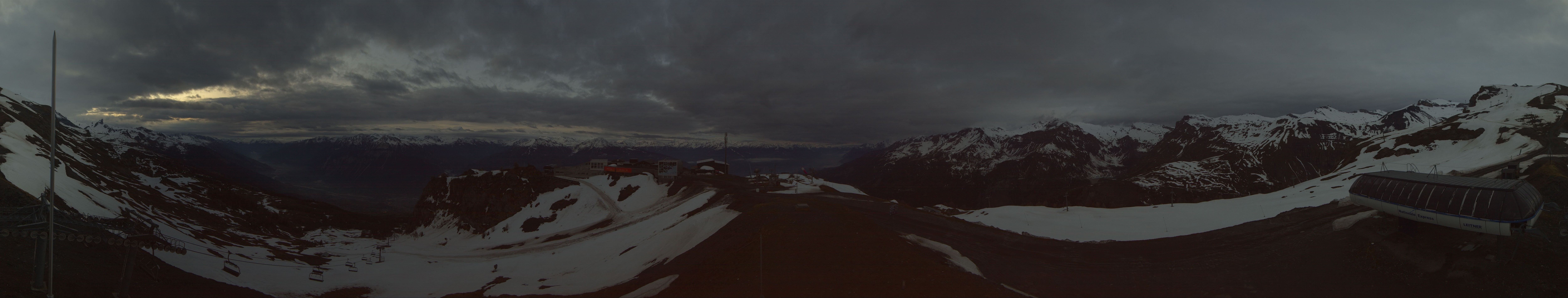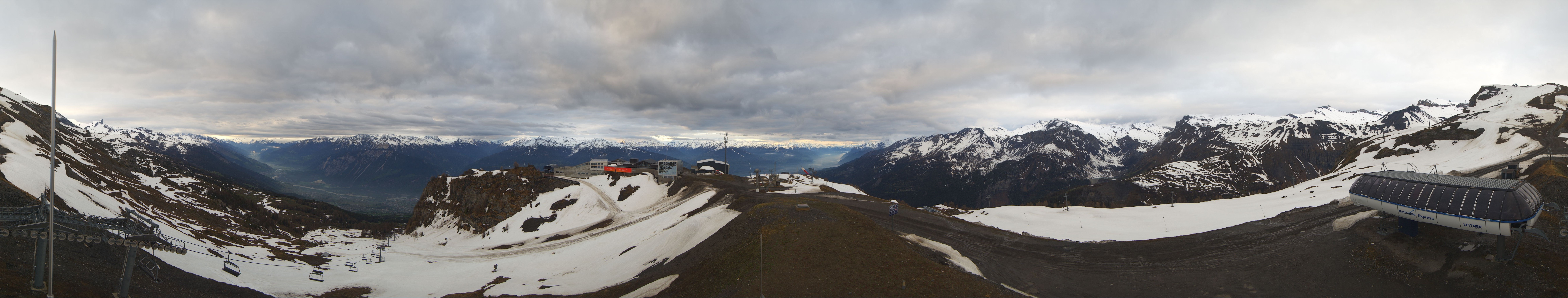 Aussicht von der Bergstation der Sesselbahn Nationale über das Skigebiet von Crans Montana. Im Hintergrund sieht man den Alpenhauptkamm mit den Viertausendern des Wallis.