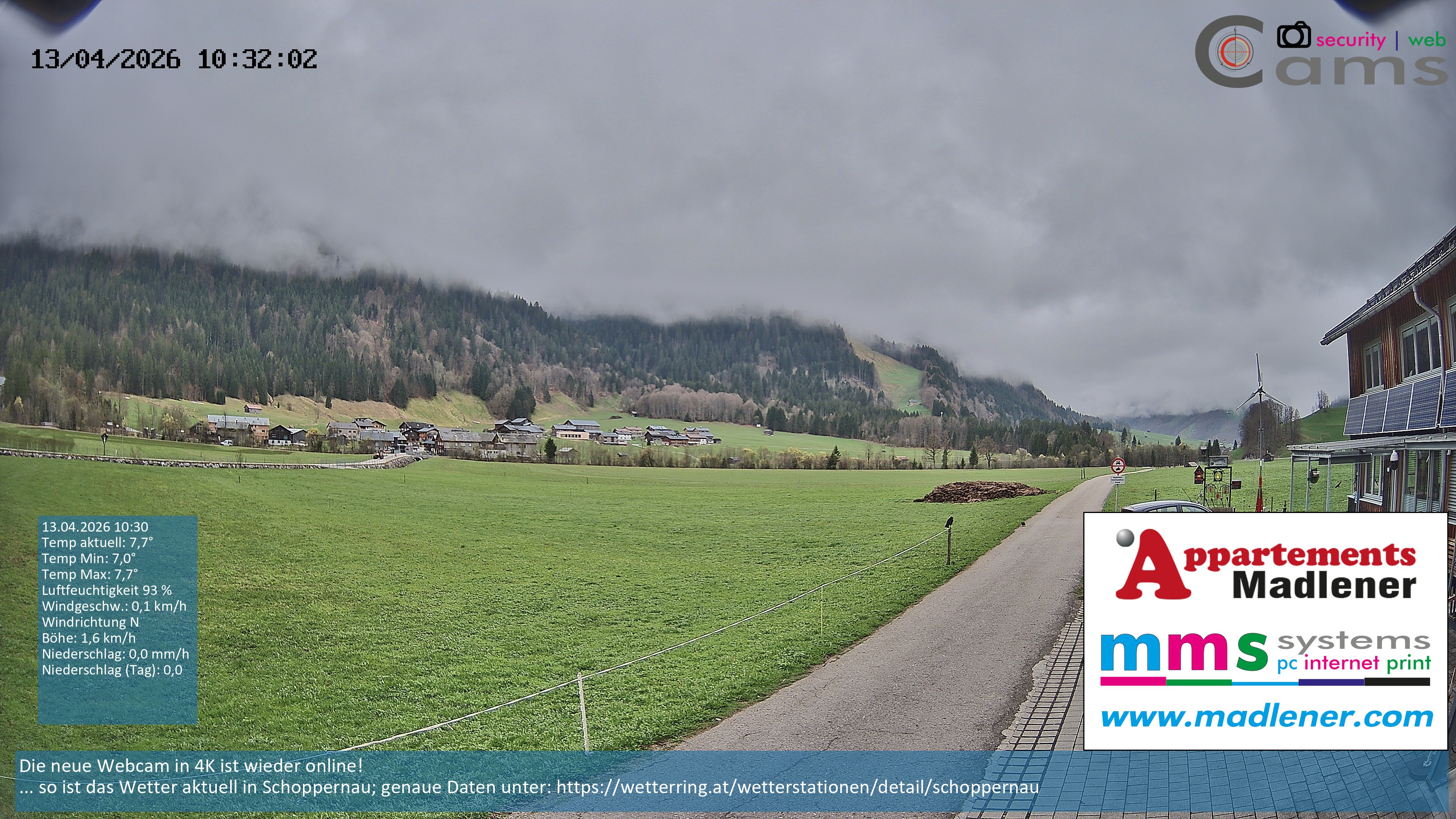 Archived webcam image showing Schoppernau lower valley on 13 Apr 2026 at 10:08 09:00