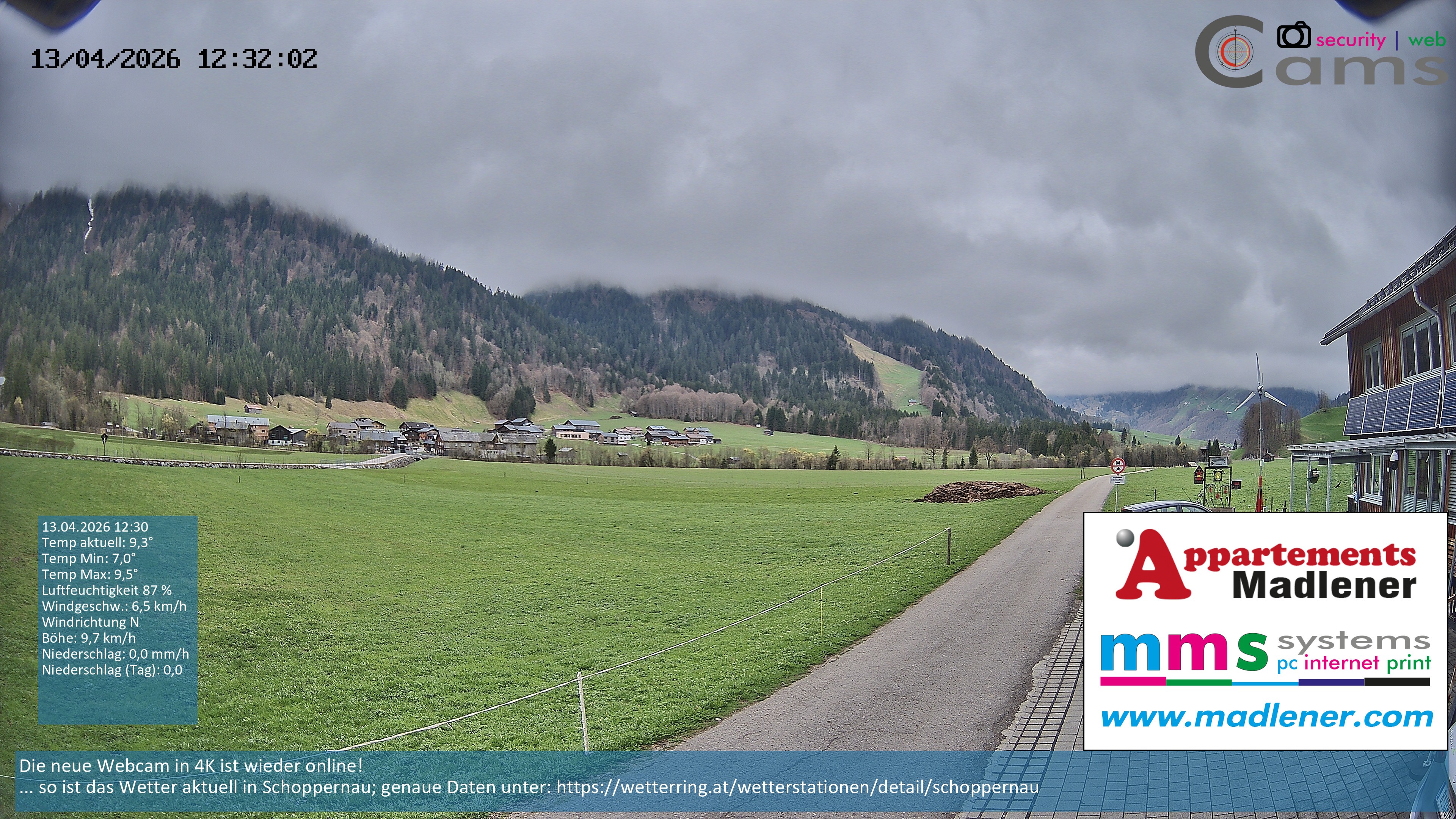 Archived webcam image showing Schoppernau lower valley on 13 Apr 2026 at 12:08 11:00