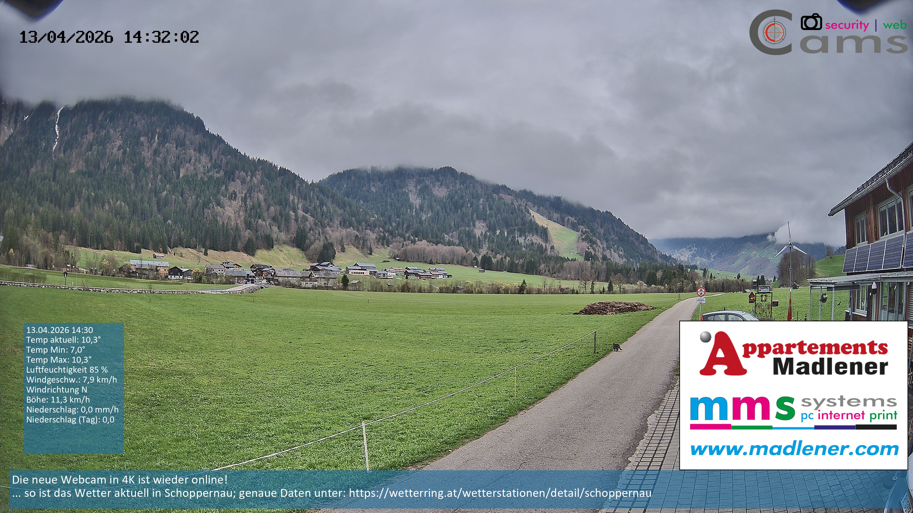 Archived webcam image showing Schoppernau lower valley on 13 Apr 2026 at 14:08 Aktuell