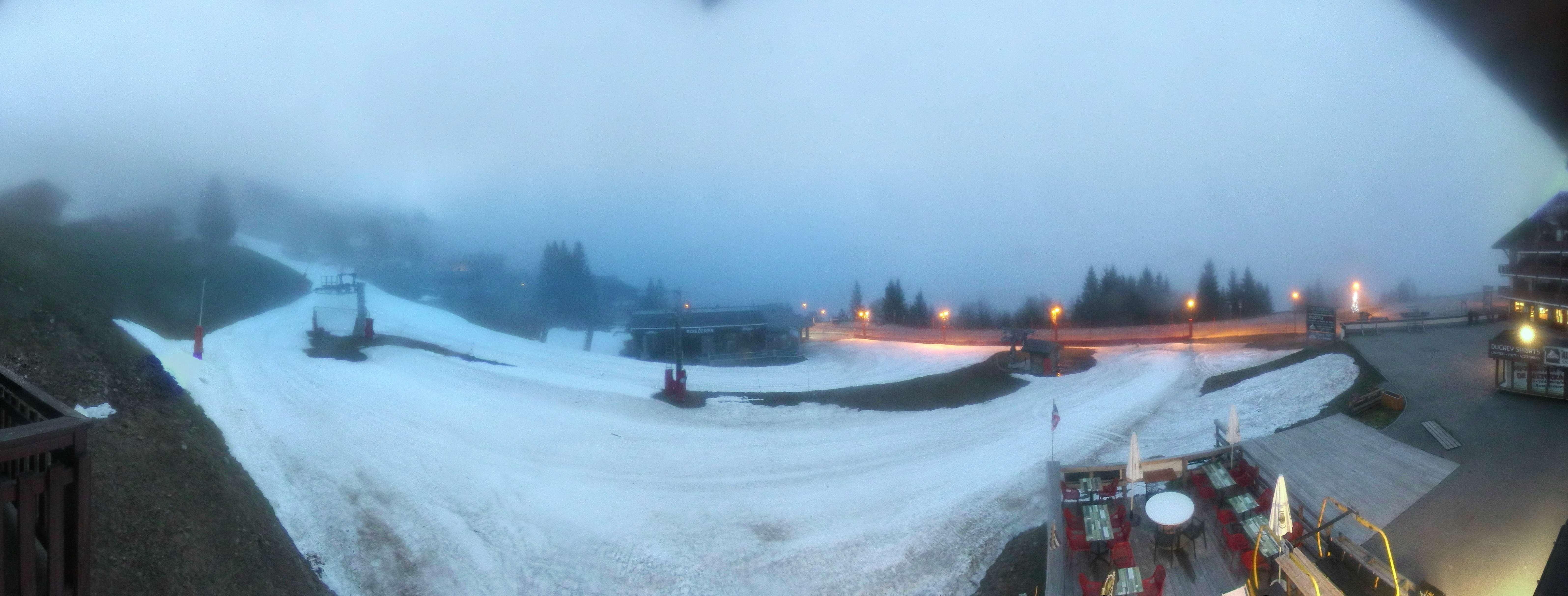 Blick auf die Pisten des Skigebiets Espace Diamant am Bisanne 1500. Im Vordergrund ist die Talstation des Sessellifts Rosières zu sehen, im Hintergrund erkennt man die Berge Mont Blanc (4.810m), Rocher du Vent (2.360m), Aiguille du Grand Fond (2.920m), Pierra Menta (2.714m) und Mont Mirantin (2.460m).