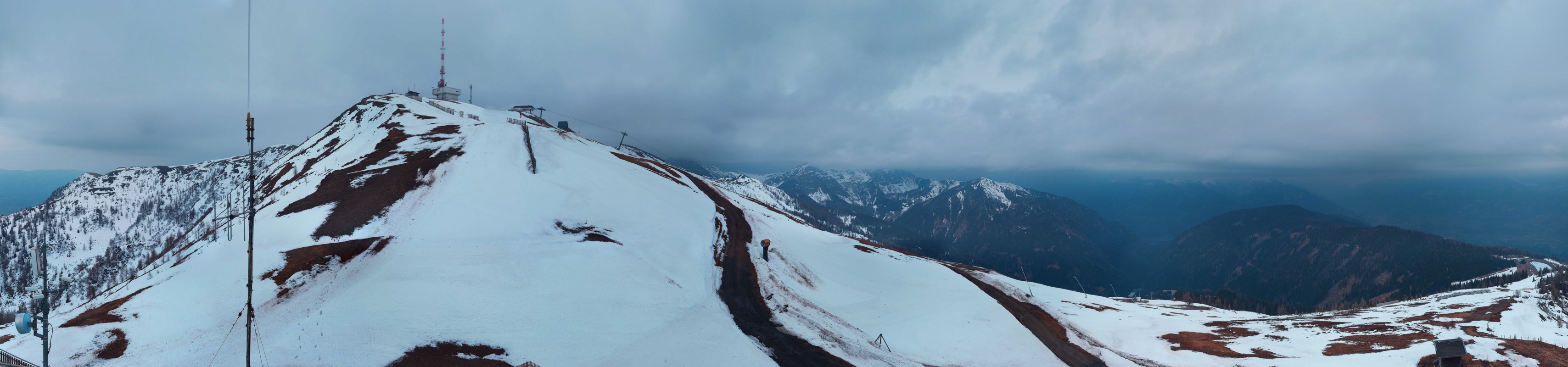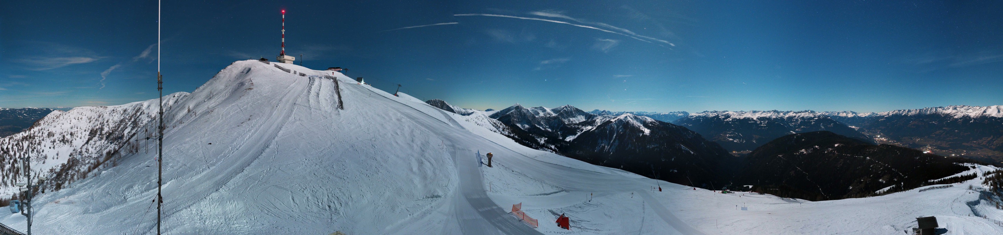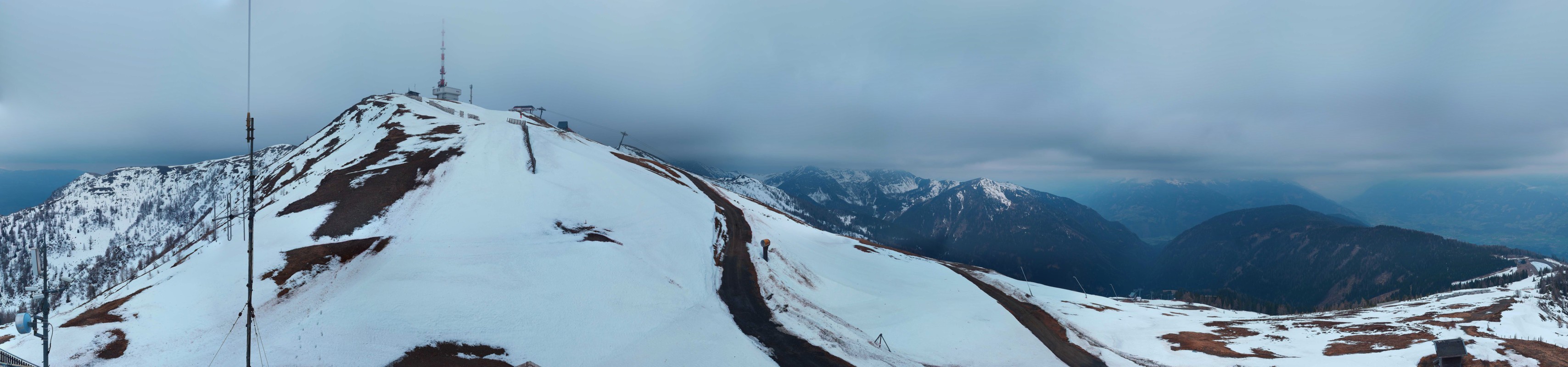 360-Grad-Blick von der Wetterstation unweit vom Gipfel des Goldecks. Zu sehen sind unter anderem das Gipfelkreuz, die Panoramaalm und die Bergstation der 6er-Sesselbahn "Skyliner".