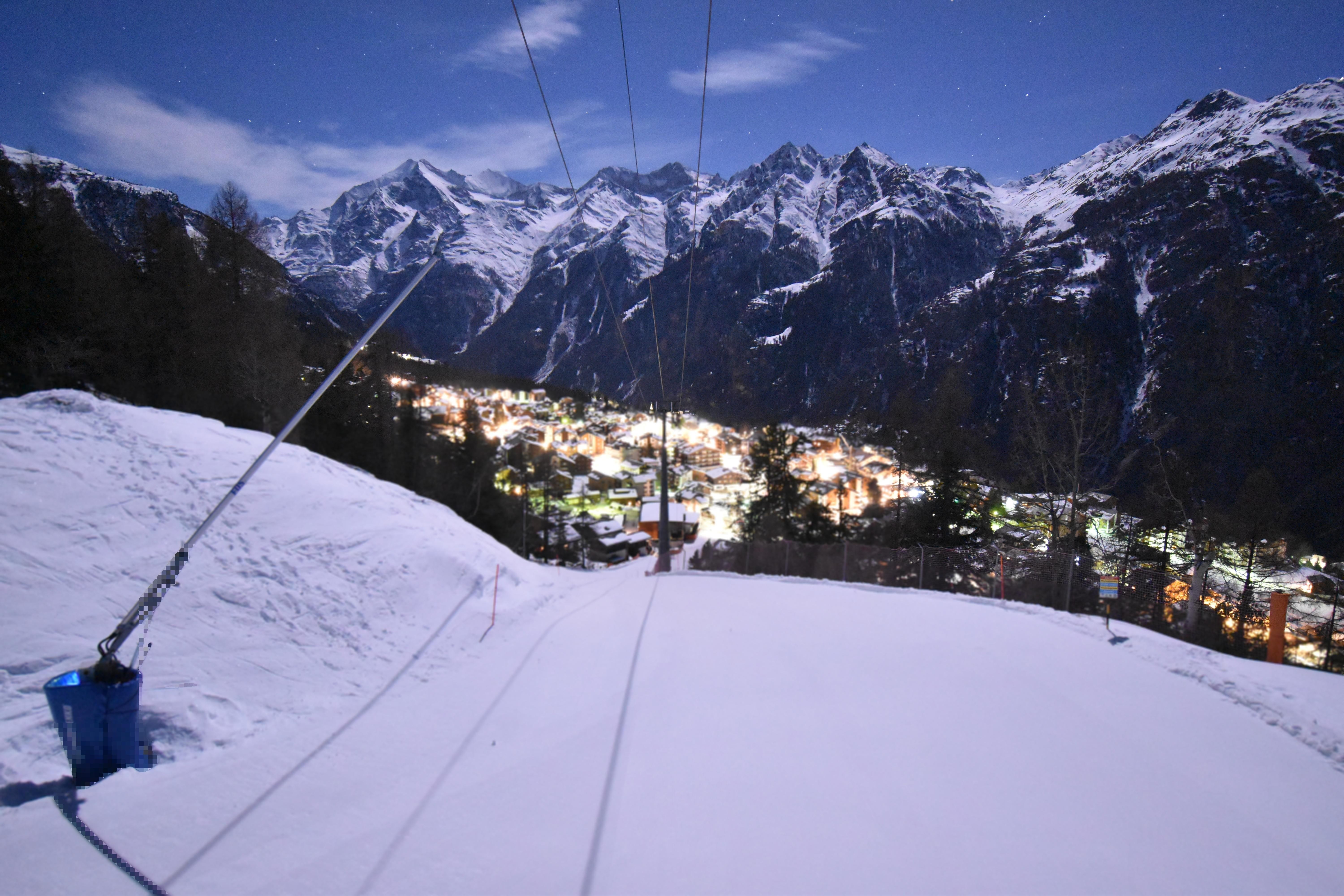 Blick von der Talabfahrt des Skigebiets auf das Dorf Grächen und die Talstation der Bergbahn.