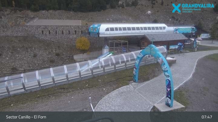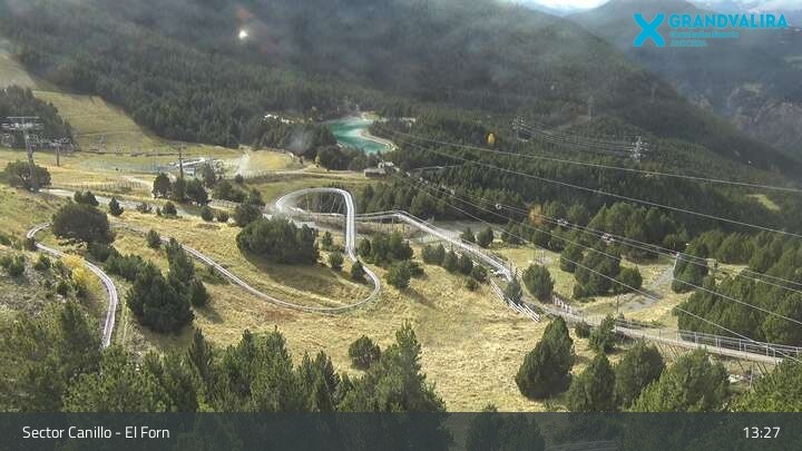 Aussicht über das Gebiet von El Forn oberhalb von Canillo, das mit der gleichnamigen Gondelbahn erschlossen wird. Hier befindet sich das Kinderland sowie die Talstation des Sessellifts Portella