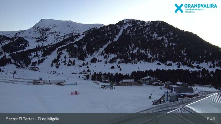 Zu sehen ist der Bereich El Tarter im Skigebiet Grandvalira. Die Webcam ist an der Mittelstation positioniert. Gut zu erkennen ist unter anderem der große Snowpark und der Anfängerbereich. In diesem Bereich verläuft auch die Weltcupabfahrt Àliga.