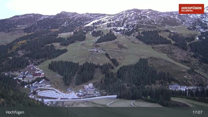 Die Panoramaaufnahme zeigt den Parkplatz Klausboden, von wo aus man in das Skigebiet Hochfügen im Zillertal einsteigt.