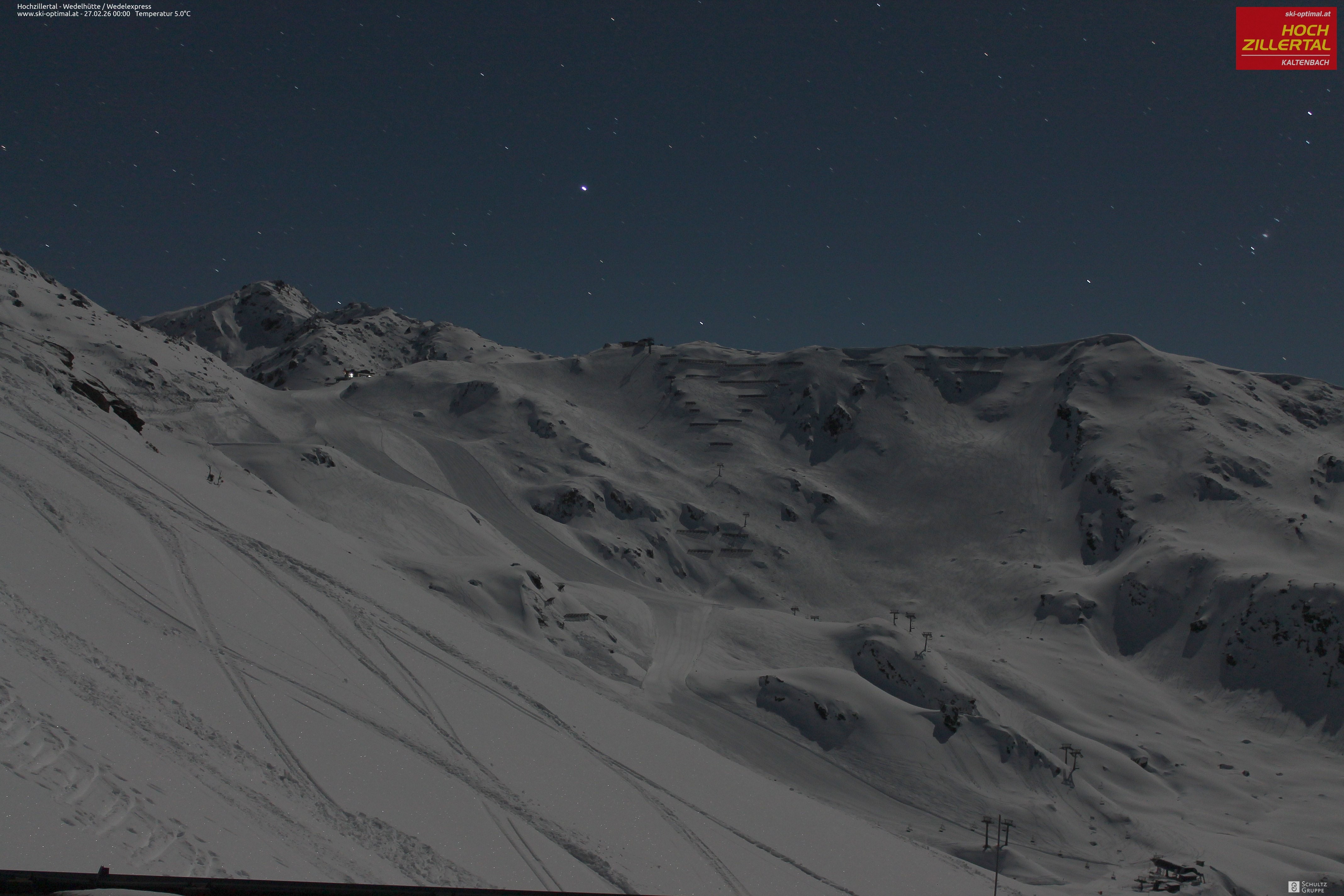 Aussicht auf die Wedelhütte im Hochzillertal. Hier kann man mitten im Skigebiet auf 5-Sterne Niveau nächtigen. Daneben erkennt man den Sessellift Wedel-Express.