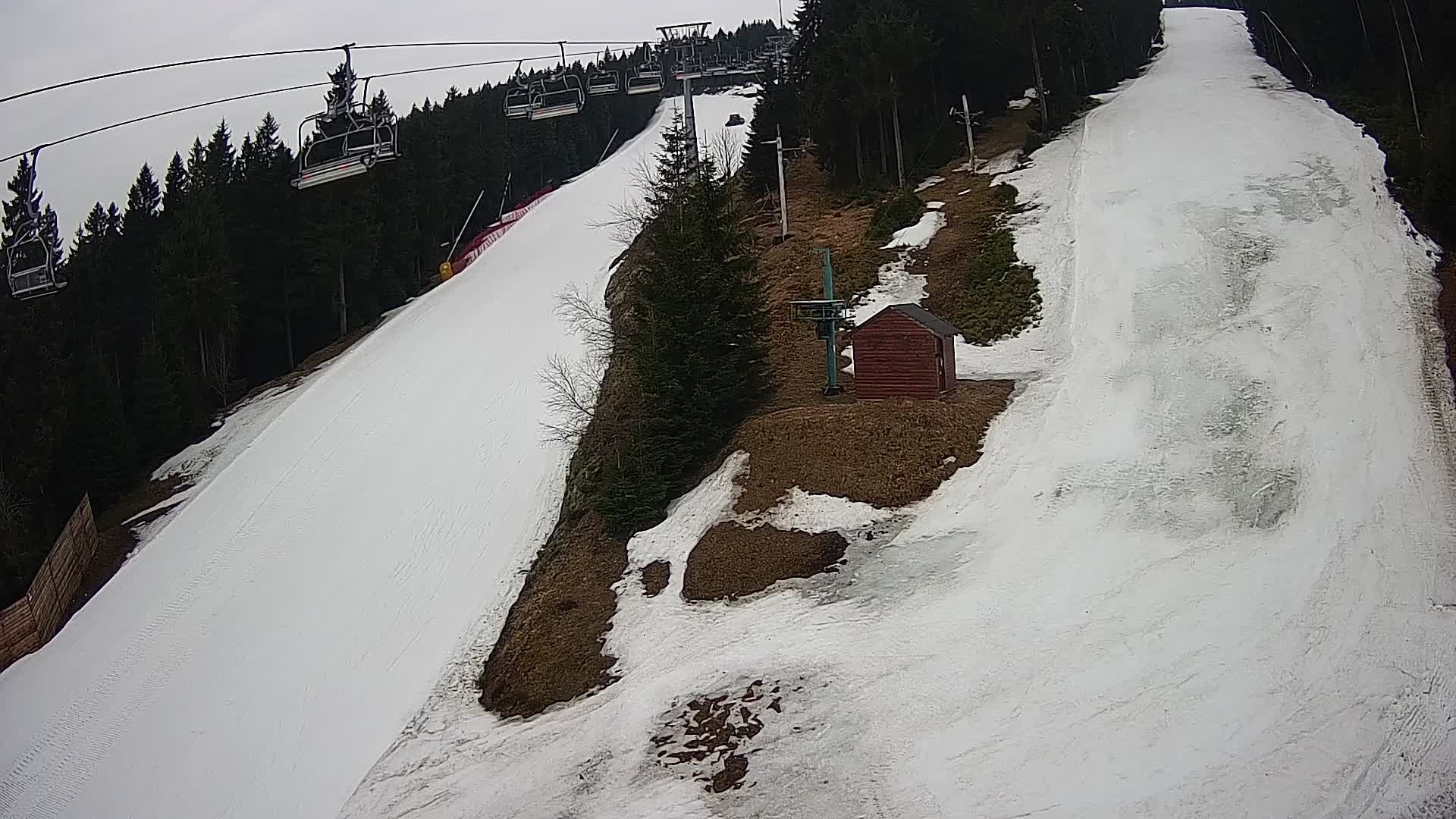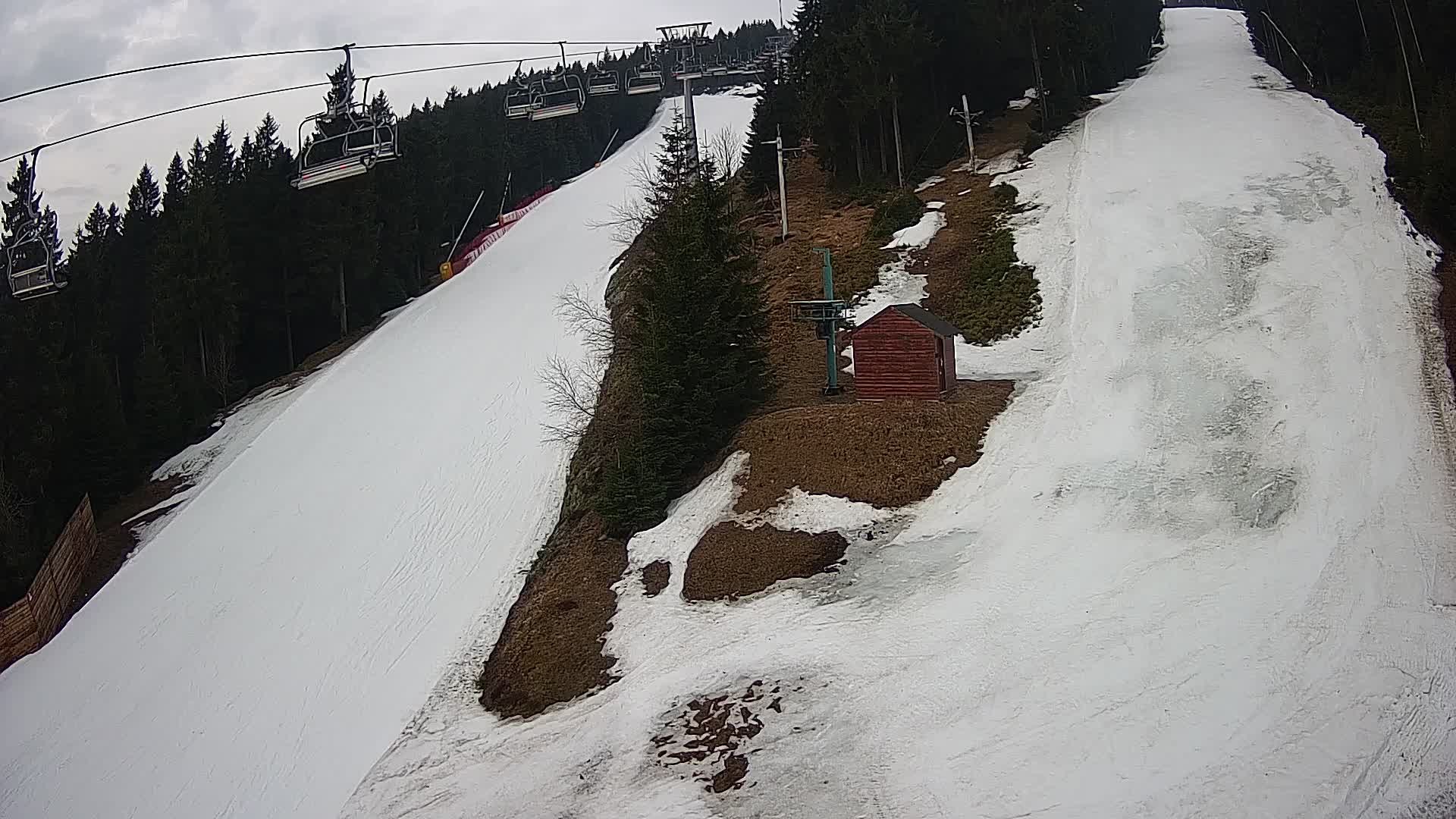 Aussicht vom Keilberg ins Erzgebirge. Im Blickfeld dieser Webcam ist der 4er-Sessellift Suzuki, der die Wintersportler auf den Keilberg bringt. Darunter befinden sich die beliebte, rot gekennzeichnete Piste Nummer 8, die mit ihren 1650 Metern Länge zu den längsten Pisten im Skigebiet zählt.