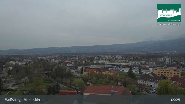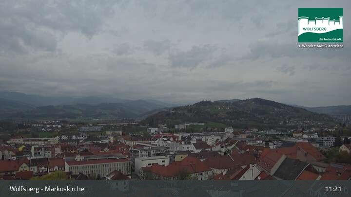 Die Webcam eröffnet die Sicht von der Markuskirche auf die Kärntner Ortschaft Wolfsberg im Lavanttal. Zu sehen ist unter anderem die Altstadt sowie das Schloss Wolfsberg.