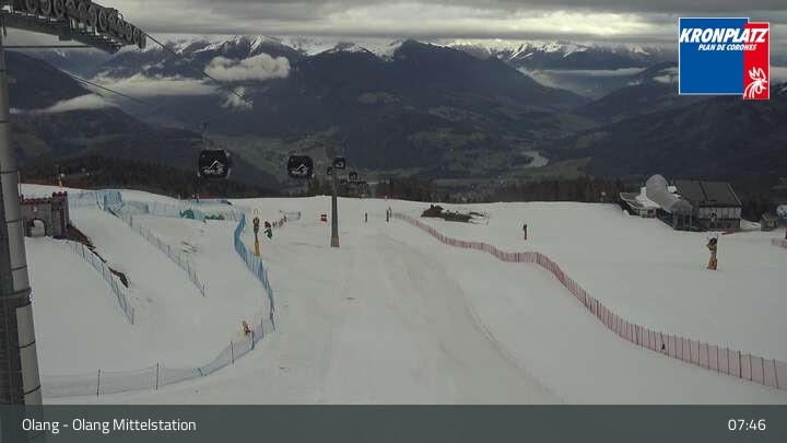 Die Webcam befindet sich an der Mittelstation, wo sich die Gondelbahnen Olang 1° und Olang 2° treffen. Sie blickt auf die Pisten des umliegenden Skigebiets Kronplatz.