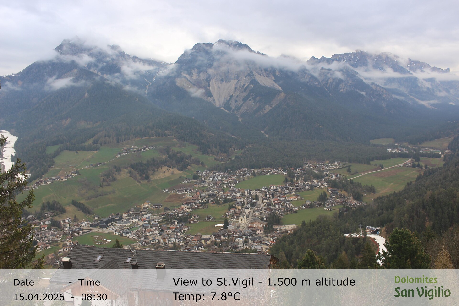 Archived webcam image showing View towards San Vigilio in South Tyrol at 1.500 m on 15 Apr 2026 at 08:43 Aktuell