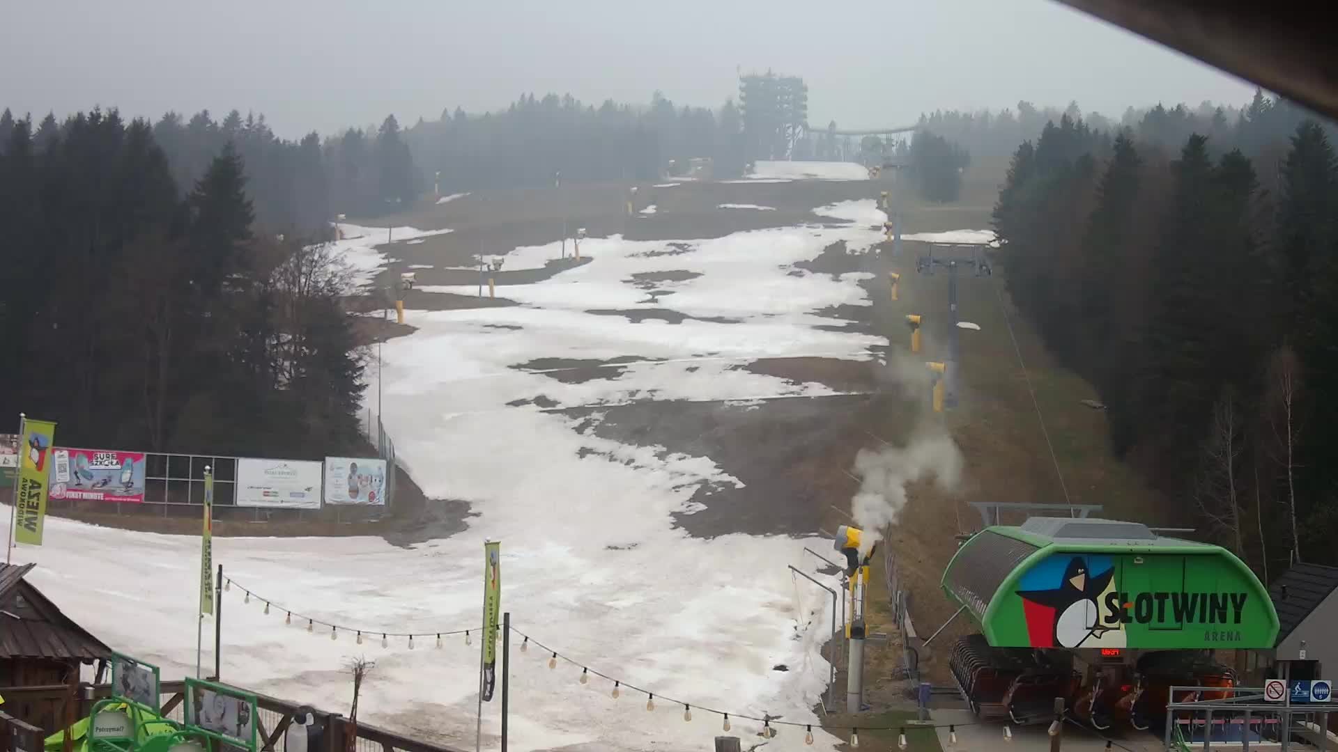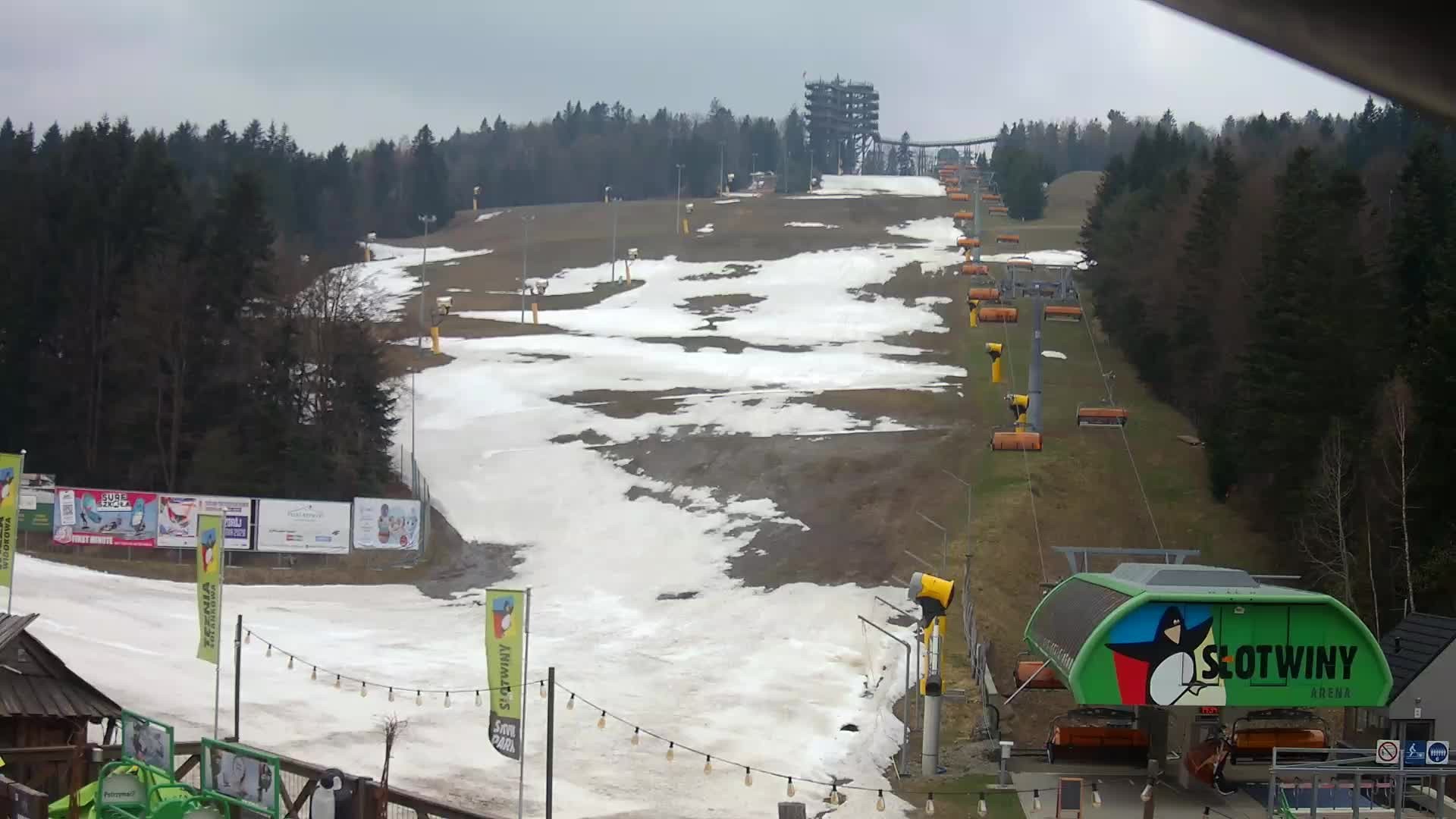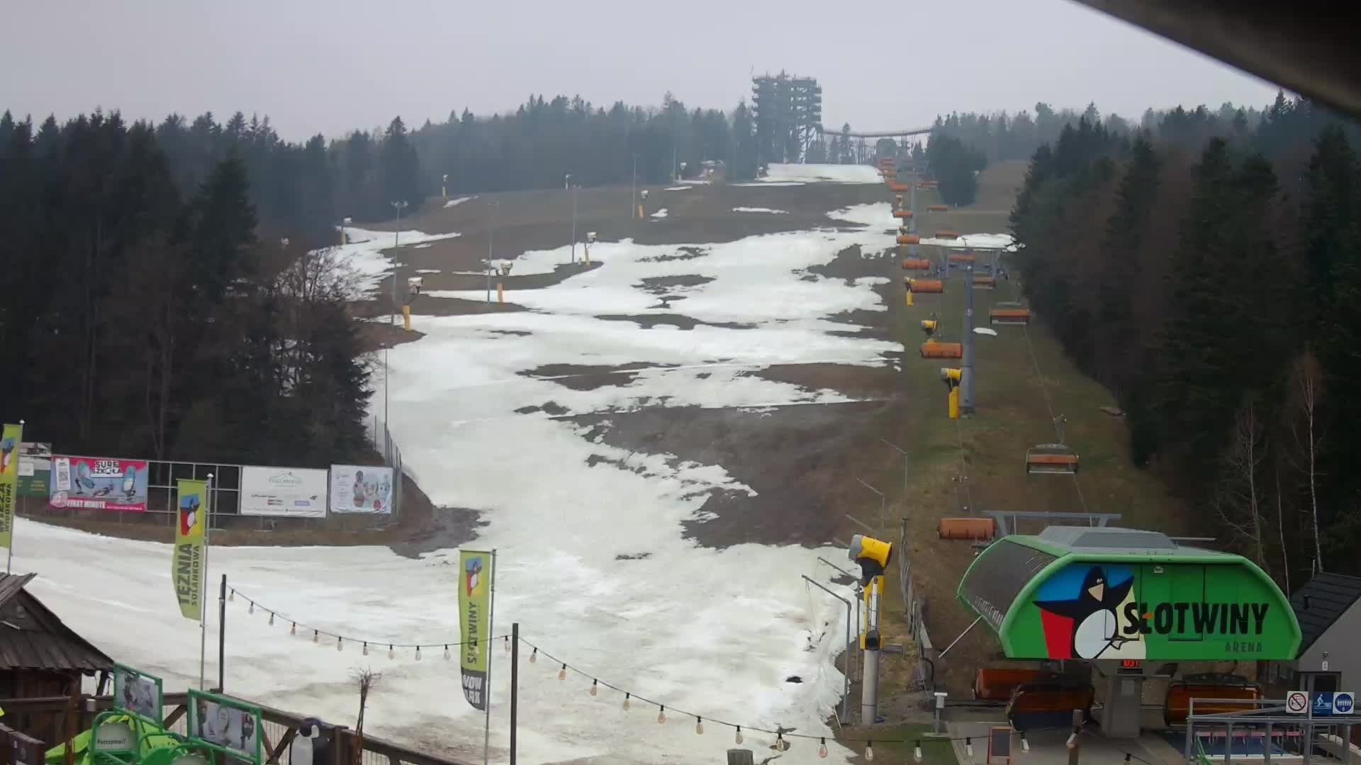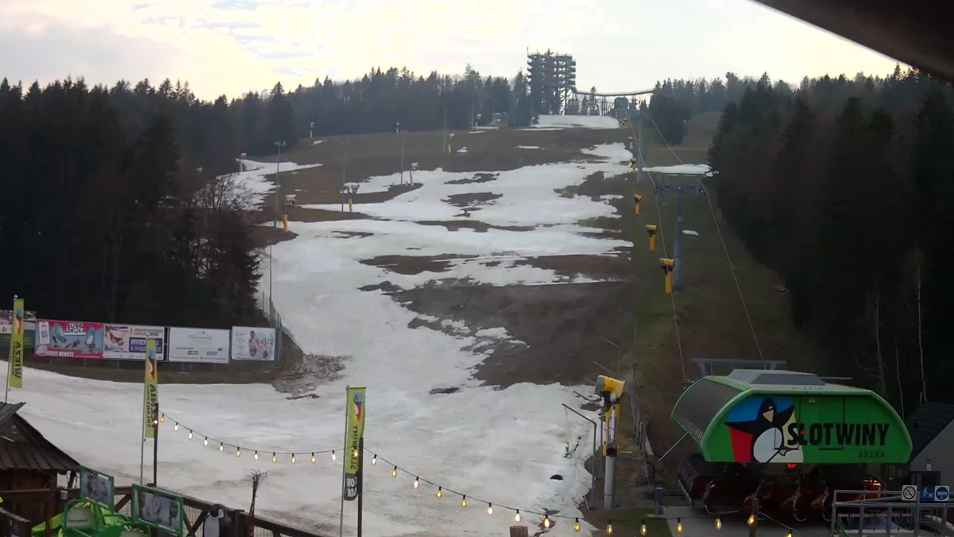 Die Webcam befindet sich an der Talstation des Sessellifts im Skigebiet Slotwiny Arena. Auf dem Gipfel ist auch der große Aussichtsturm zu sehen.