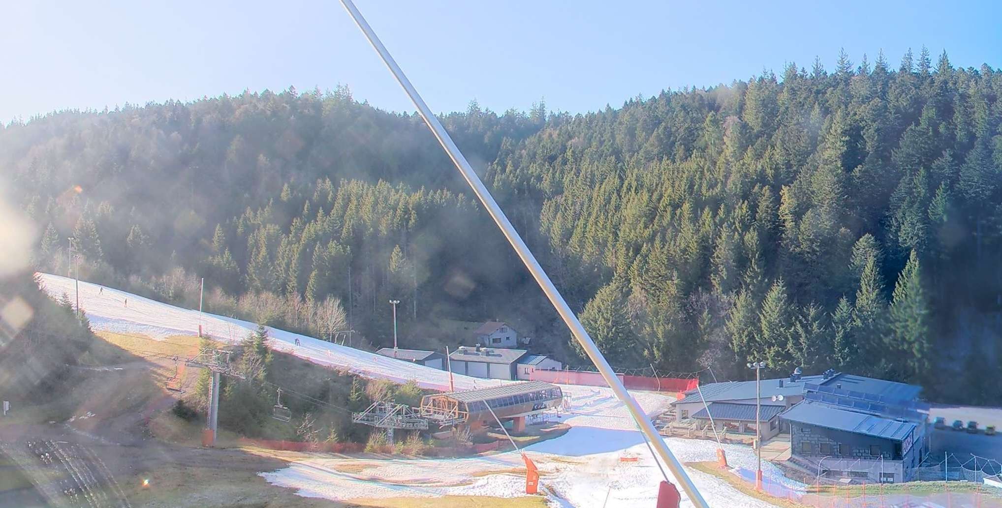 Zu sehen ist die Talstation des 6er-Sessellifts Montjoie im Skigebiet Lac Blanc. Von links kommt die rote Piste Montjoie, von rechts die beiden roten Abfahrten La Violette und Stade de Slalom.