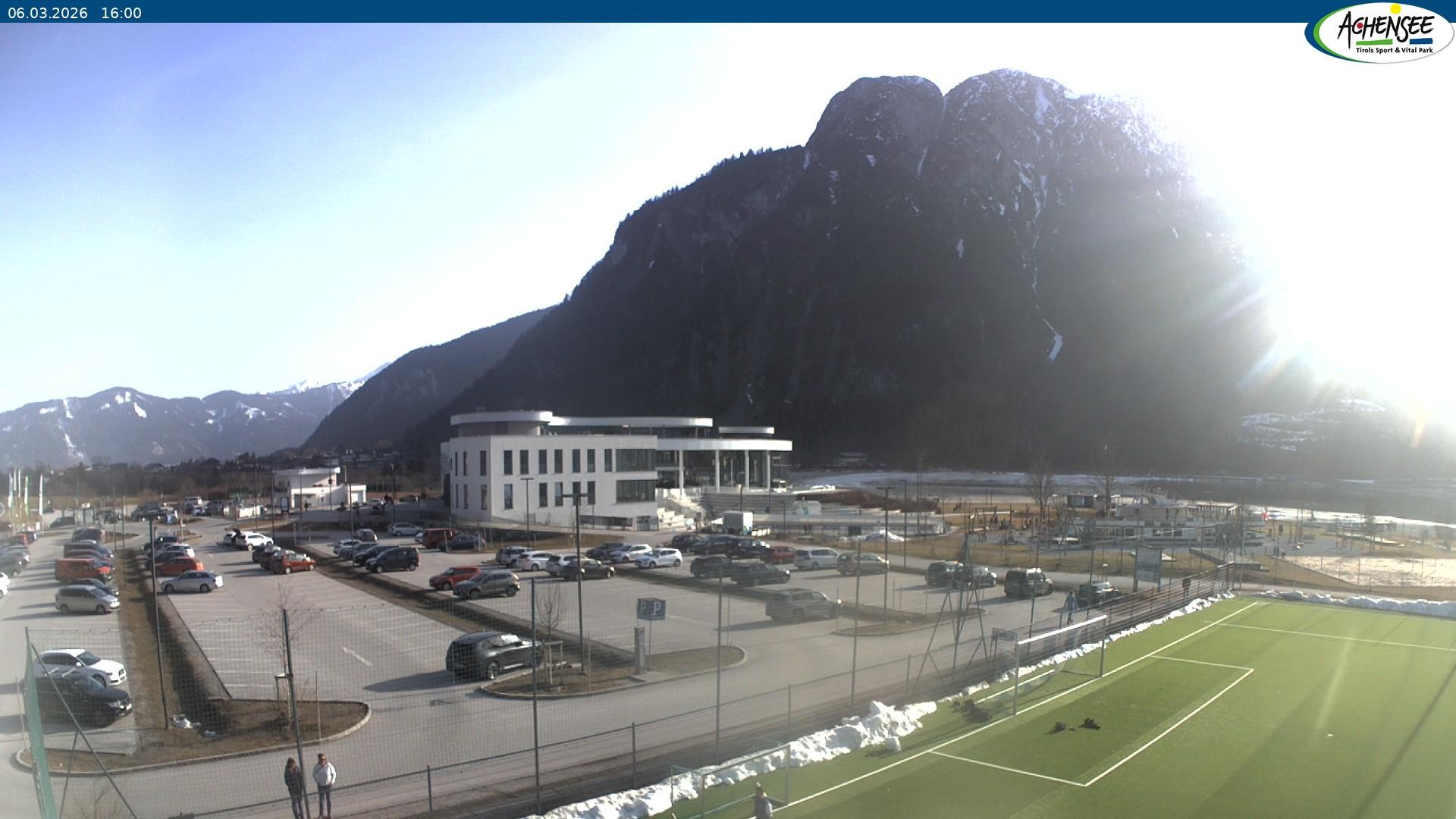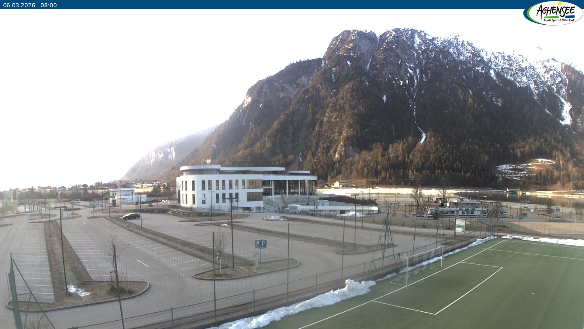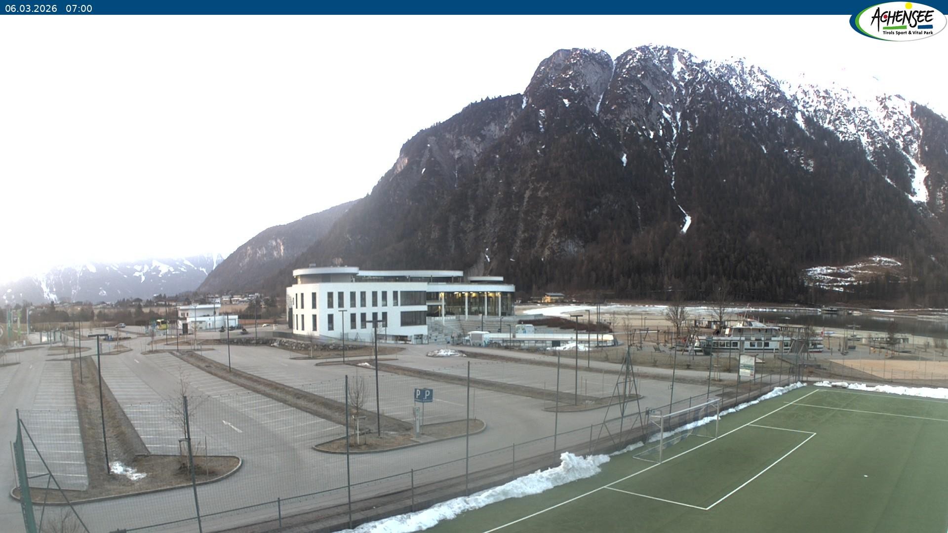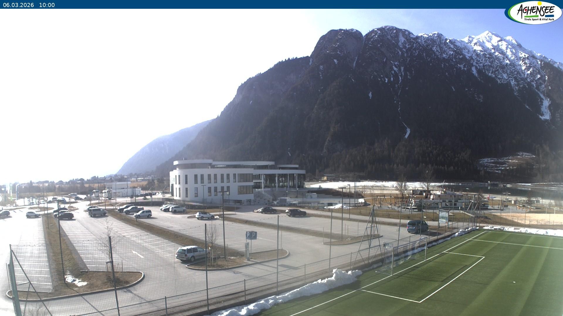 Blick über den Parkplatz auf das Atoll Achensee, ein Multifunktionskomplex mit Schwimmbad, Sauna, Eishalle und vielem mehr. Das Gebäude liegt direkt am Achensee.