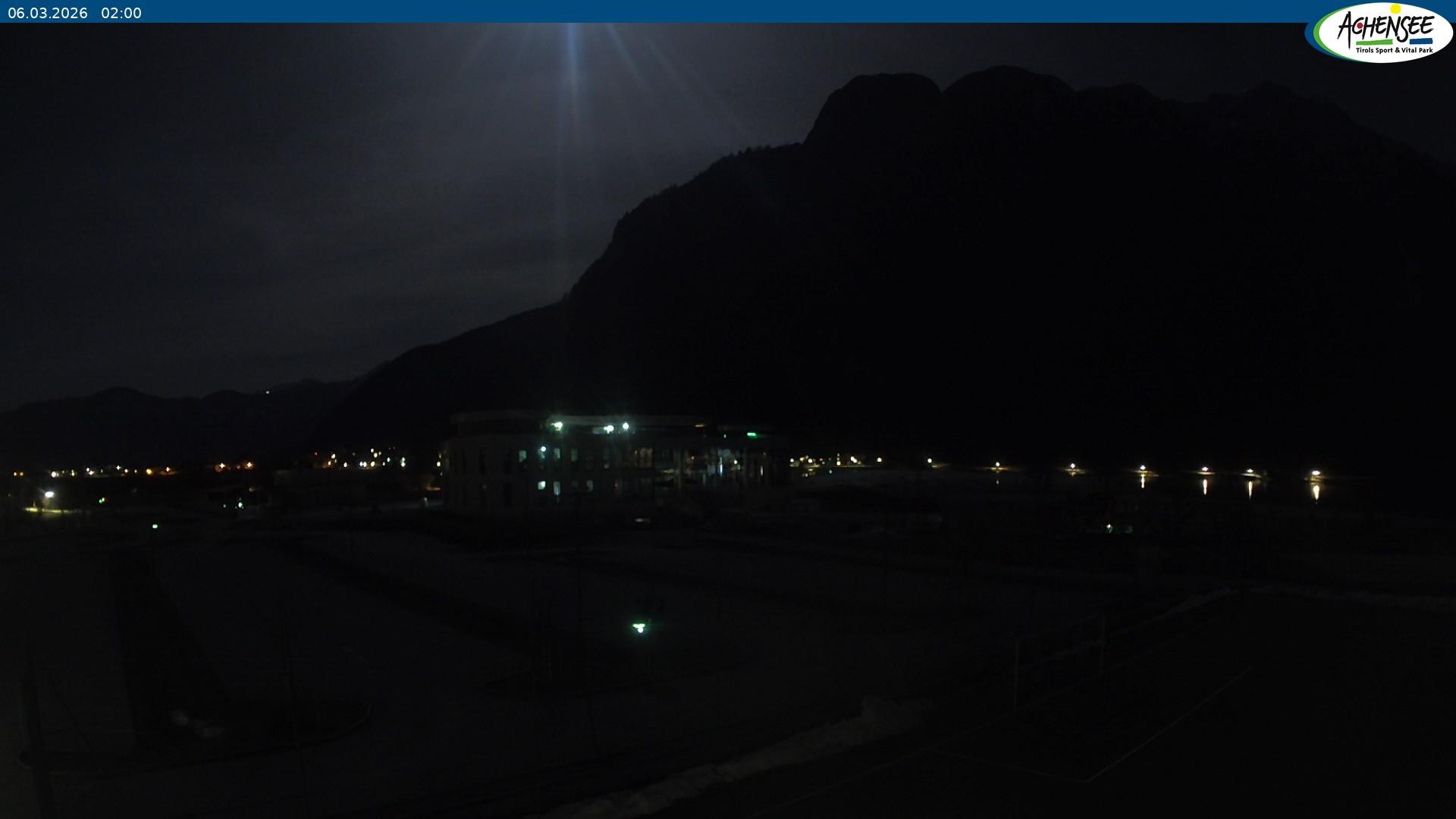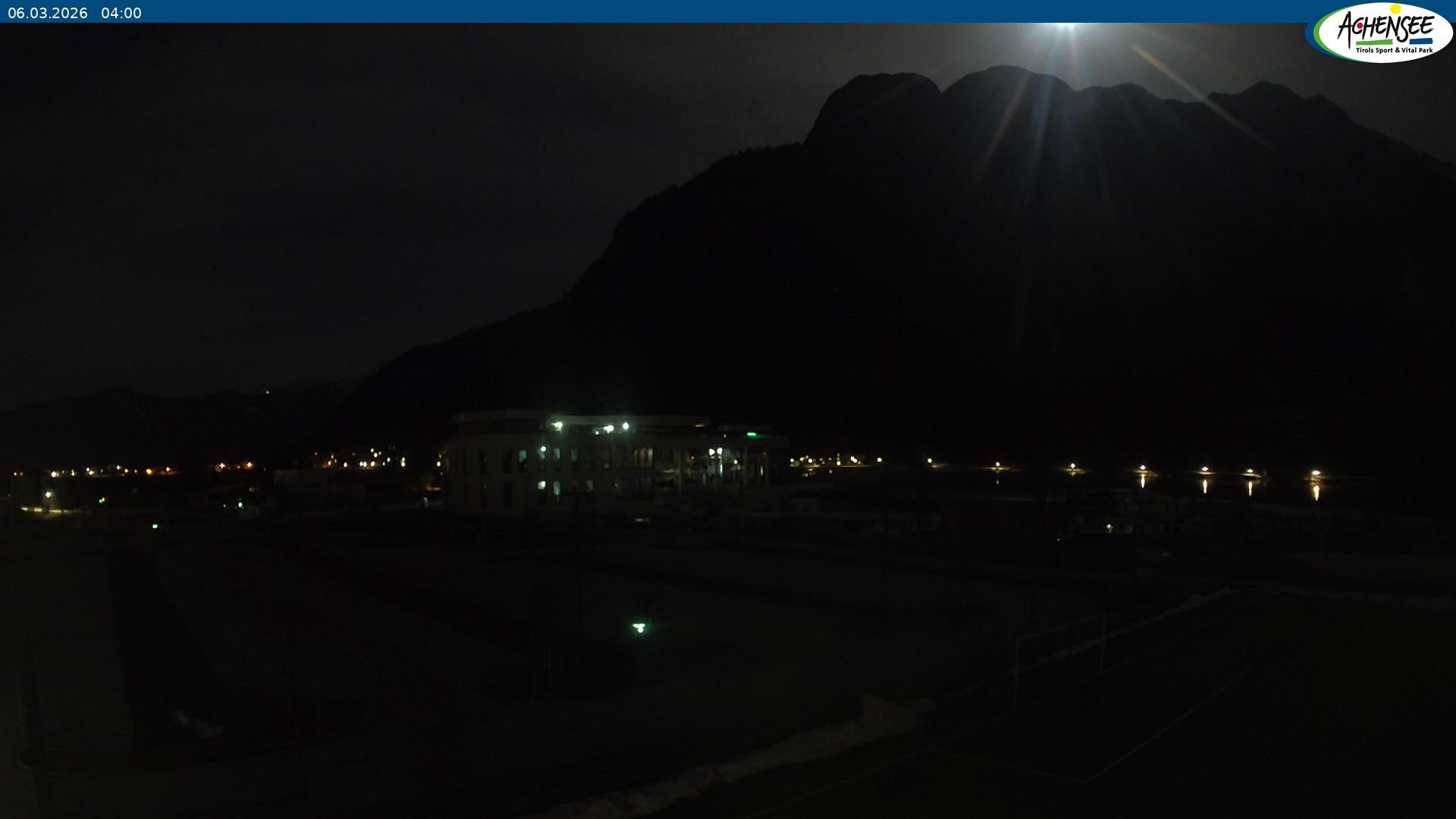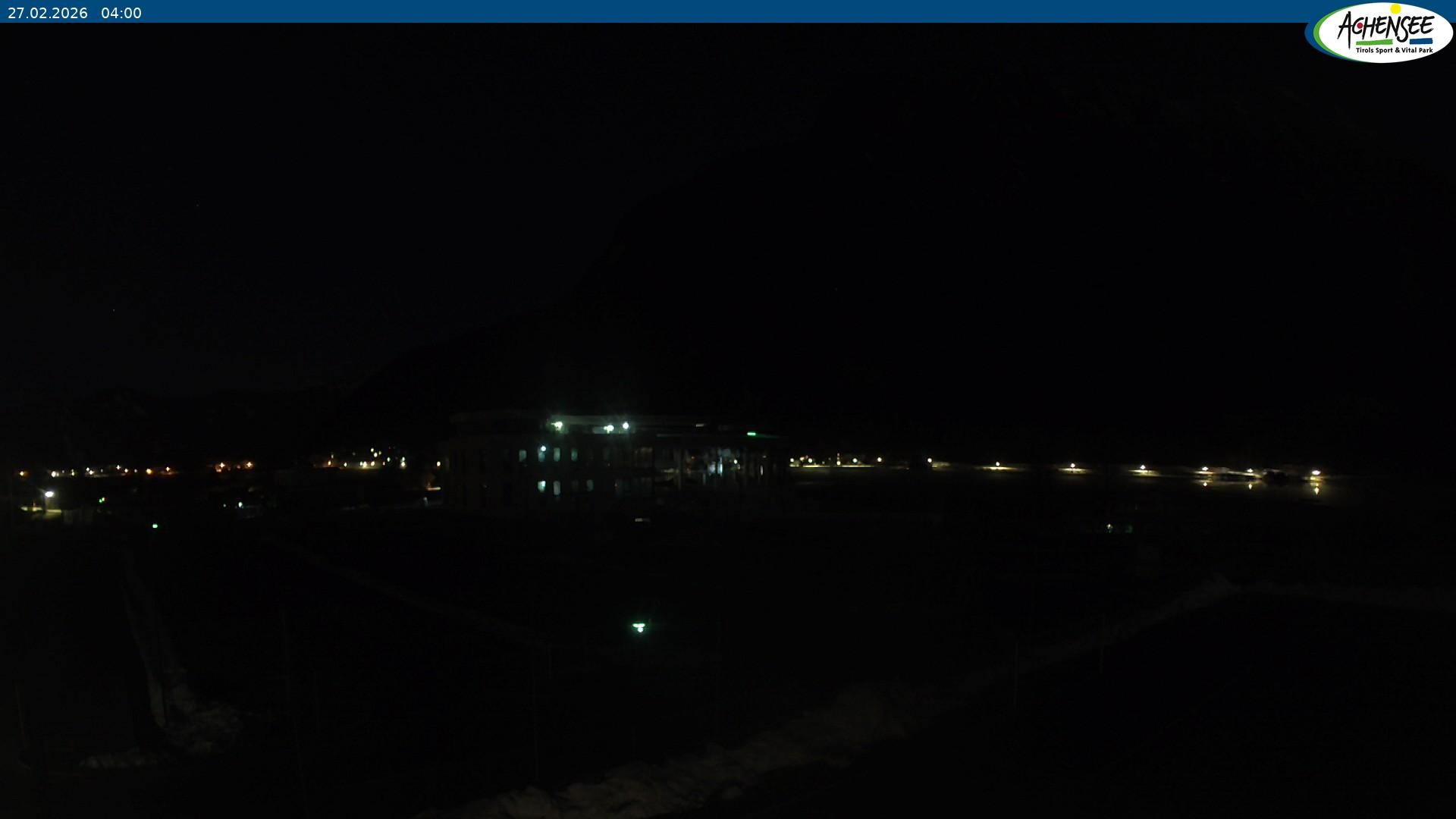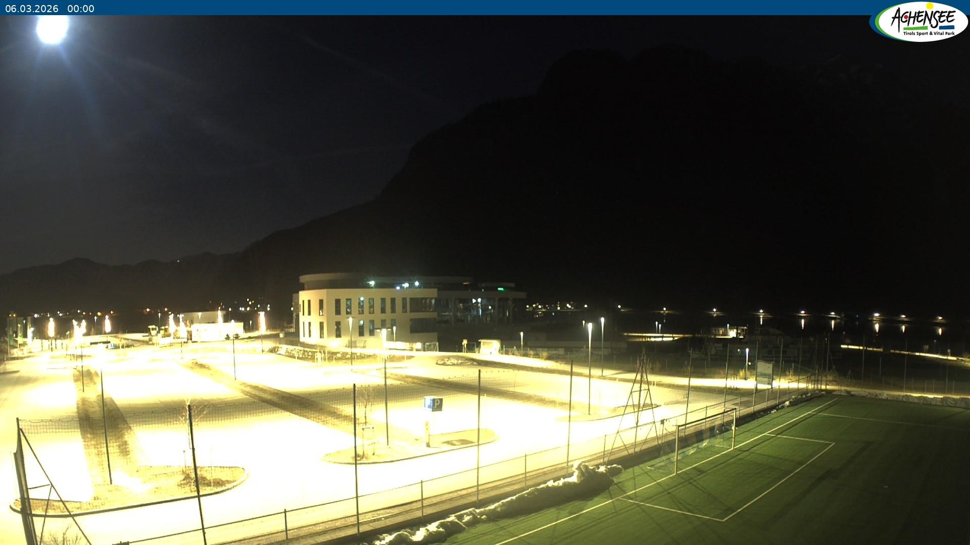 Blick über den Parkplatz auf das Atoll Achensee, ein Multifunktionskomplex mit Schwimmbad, Sauna, Eishalle und vielem mehr. Das Gebäude liegt direkt am Achensee.