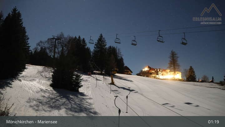 Blick von der Mönichkirchner Schwaig. Zu sehen ist der Teller-Schlepplift bei der Schwaigwiese und die 4-er Sesselbahn Schwaig im Skigebiet Mönichkirchen-Mariensee am Wechsel (Niederösterreich).