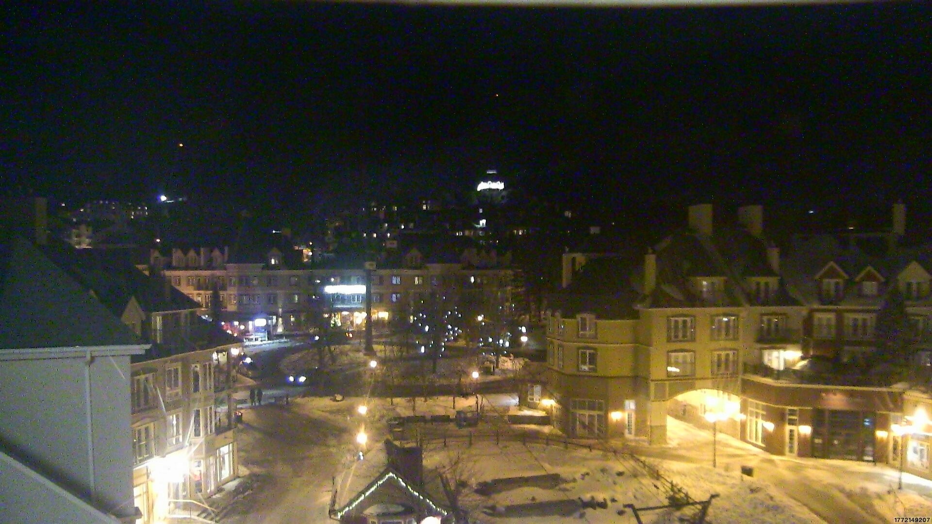 Blick auf den Place des Voyageurs in Tremblant, einem kanadischen Skigebiet. Hier befindet sich auch Talstation Cabriolet-Bahn, eine Zubringerbahn ins Skigebiet.