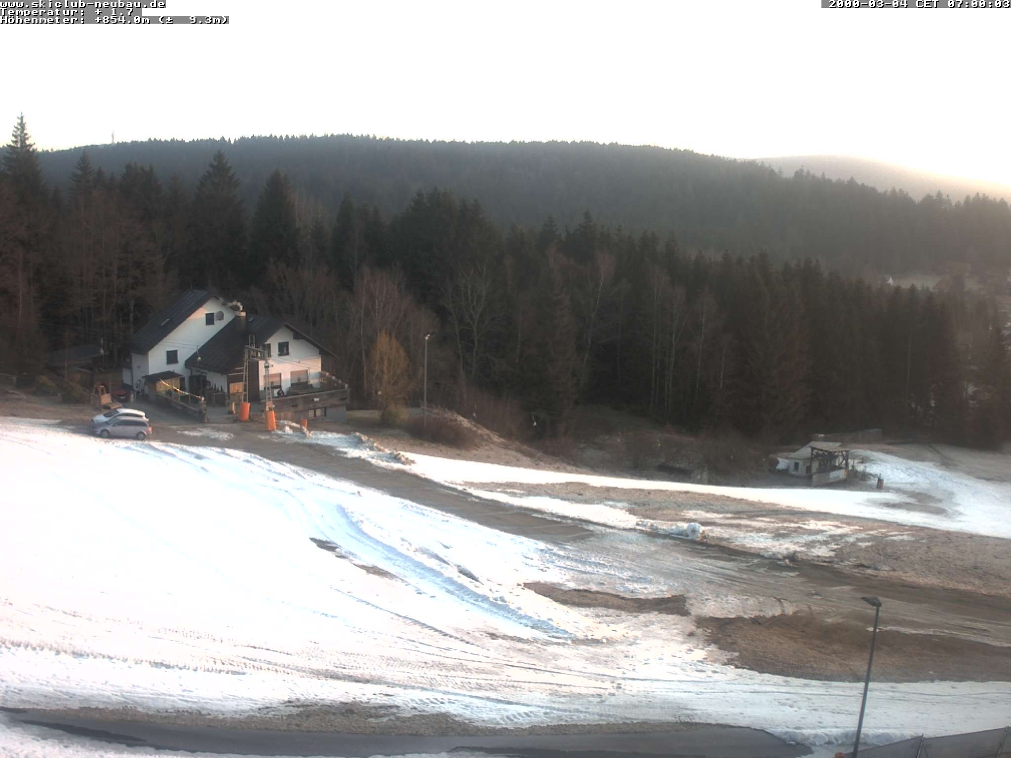 Blick auf das Wirtshaus Bleaml Alm, den Skilift und die Skipiste des Ski Clubs Neubau.