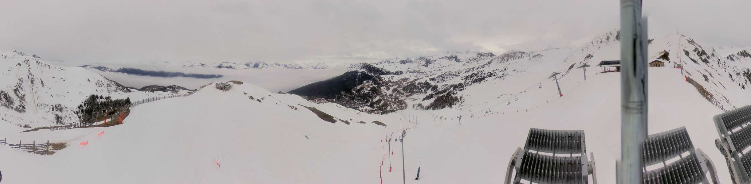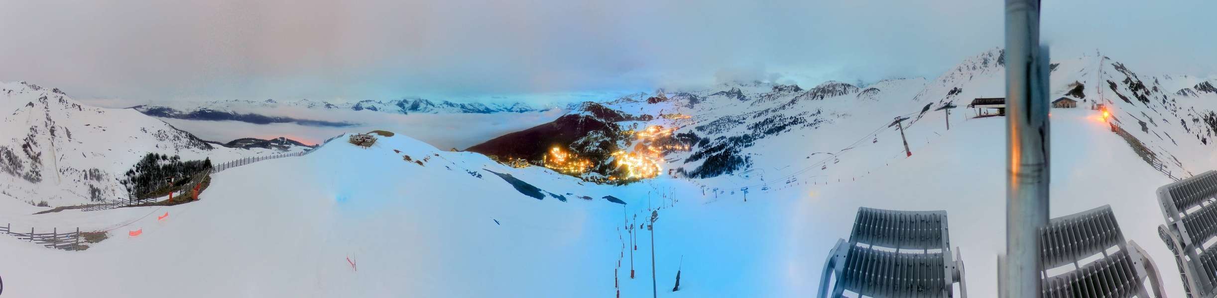 Diese Webcam zeigt die Bergstation Bécoin im französischen Skigebiet La Plagne und das umliegende Panorama.