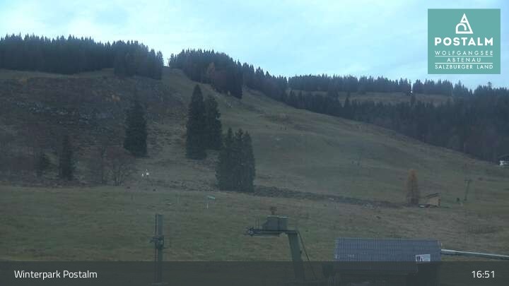 Die Webcam im Skigebiet Postalm im Salzburger Land zeigt den Winterpark mit Zauberteppich.