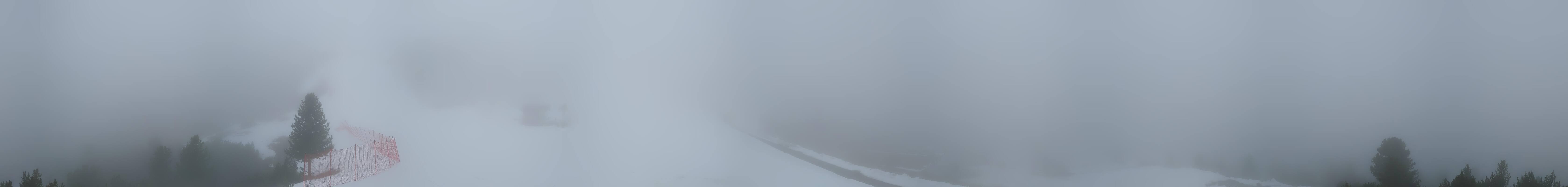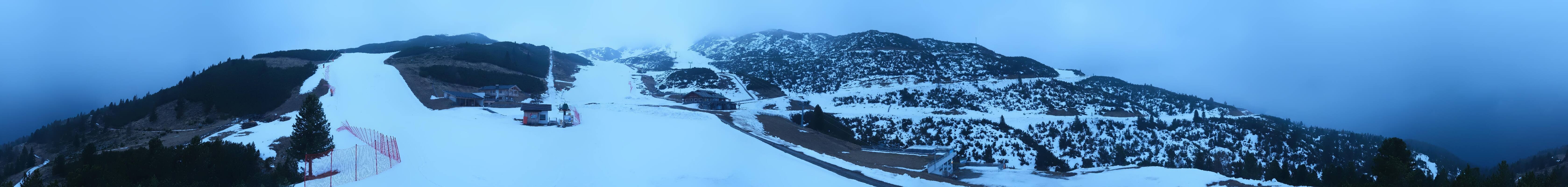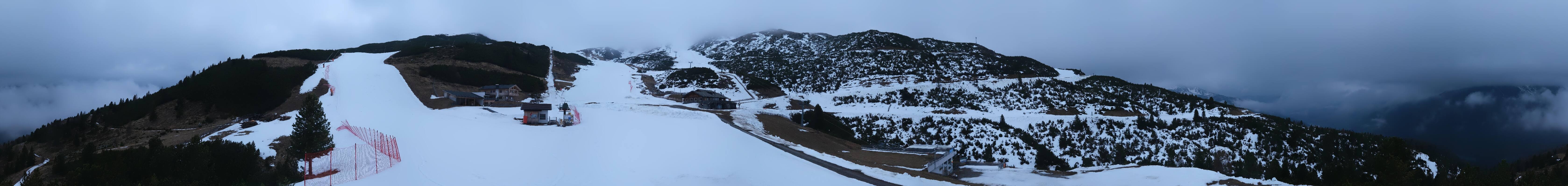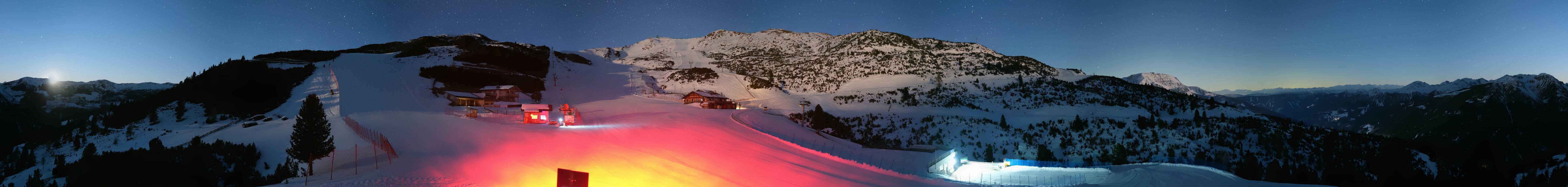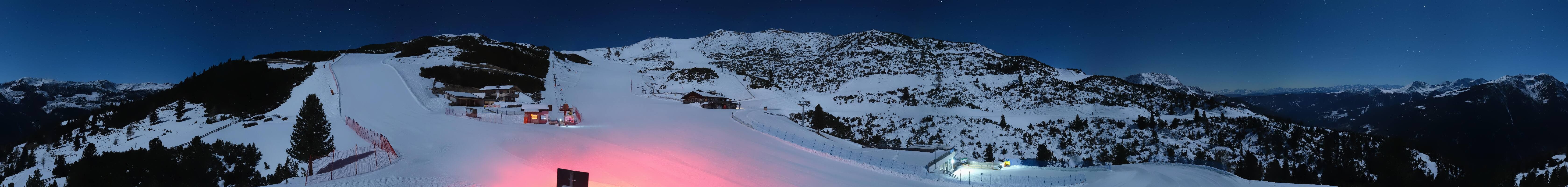 360-Grad-Panorama im Skigebiet Reinswald. Die Kamera ist positioniert nahe der Talstation des Sattele Sessellifts und zeigt unter anderem auch die Pfnatschpiste und das Restaurant Pfnatsch Alm.