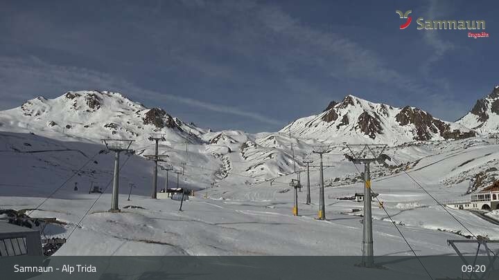 Webcam zeigt das Skigbeiet Samnaun, hier aktuelle Bilder vom Alp Trida in Blickrichtung Viderjoch.