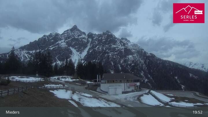 Herrlicher Blick auf den Hausberg von Mieders, die Serles, sowie auf die Rodelbahn und die Piste Waldrasteck im Tiroler Skigebiet Mieders. Gut zu erkennen sind außerdem die Bergstation der Serlesbahn am 1.600 Meter hohen Koppeneck, die Skihütte Koppeneck mit Spielplatz und der Speichersee.