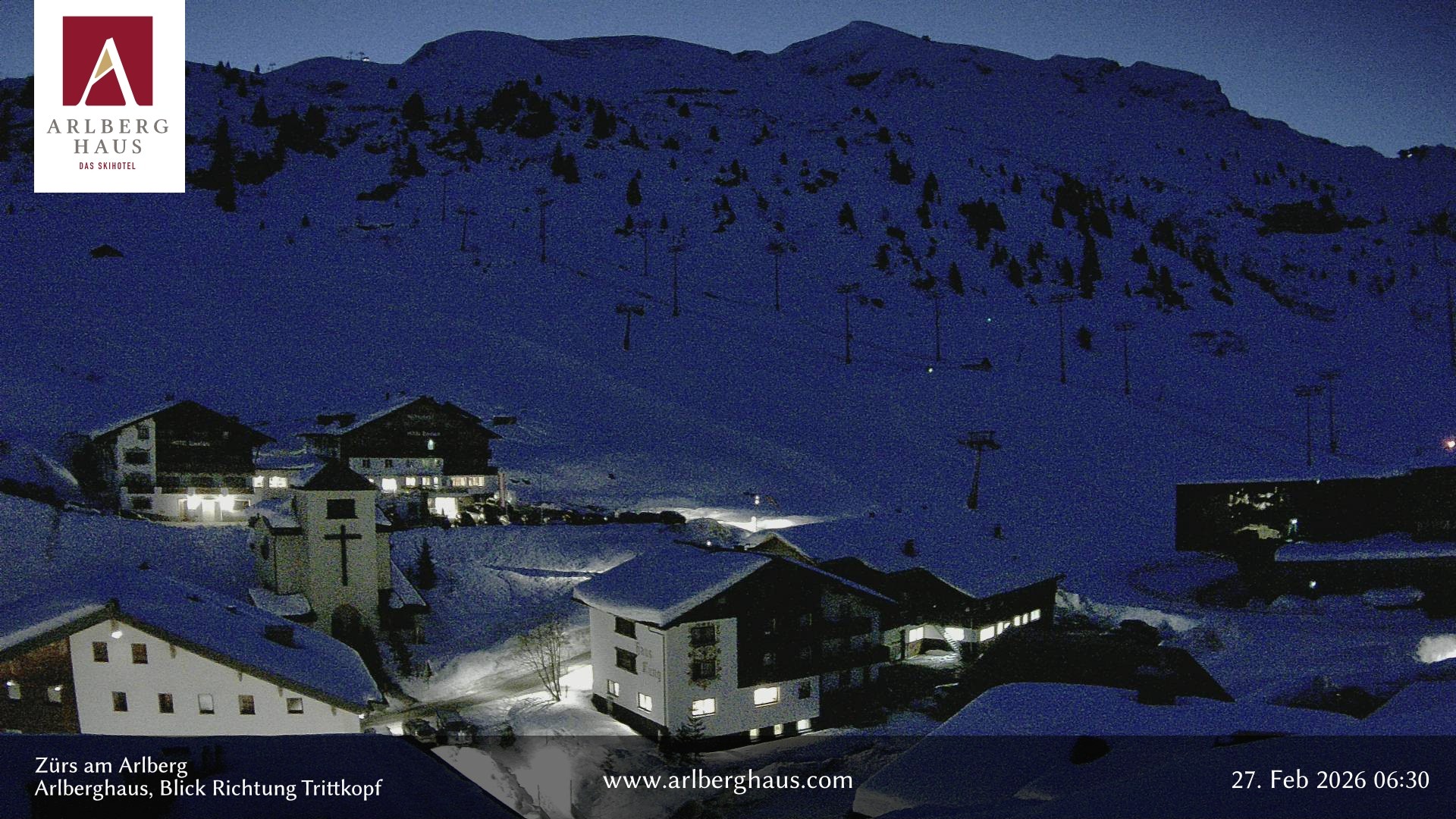 Archiviertes Webcam Bild: Hotel Arlberghaus in Zürs mit Blick auf den Weltcuphang am 27.02.2026 um 06:22 Uhr Aktuell