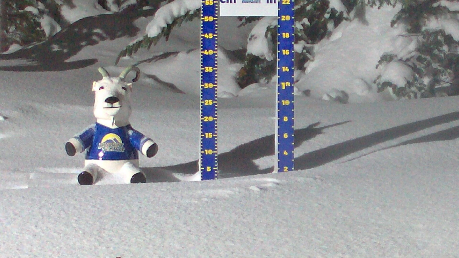 Die Webcam zeigt den aktuell gemessenen Neuschnee im Skigebiet Sunshine Village.